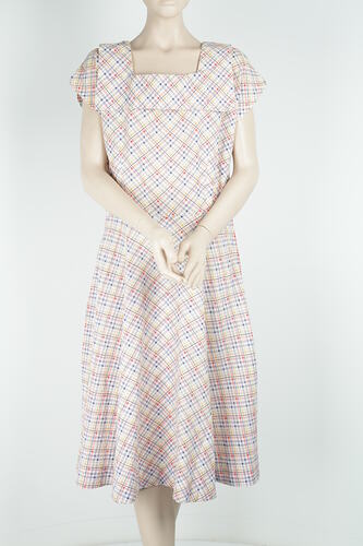 Checked cotton plisse dress, made on an early (1910) Singer sewing machine of the treadle type which was also donated by Miss Wyke (SH88.387). It was used in Kew, Victoria.
