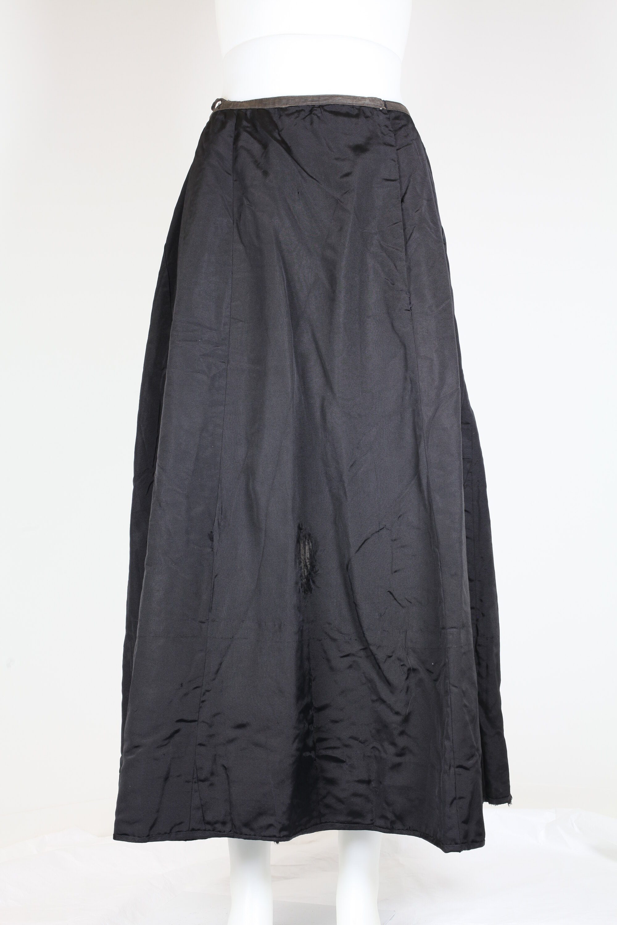 Black bombazine petticoat, floor length. Stiffened on the inside with Silesia - a fine brown glazed linen used for lining dresses. Cotton lining. Inverted pleat at back. Eight pairs of hooks and eyes at a side/front closing. Tape tightens gathers at back. Loop on waist, possibly for hanging.