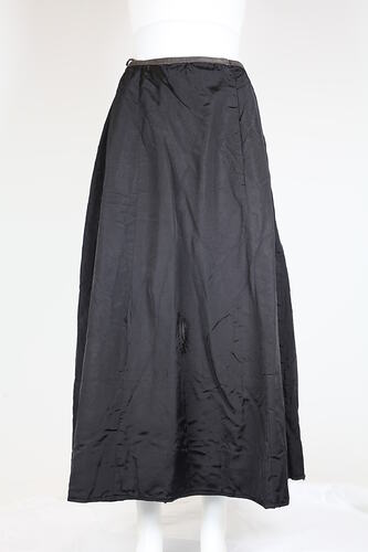 Woman's black bombazine petticoat. Belonged to Minnie Anderson of Kew. Likely to date from the late 19th century.