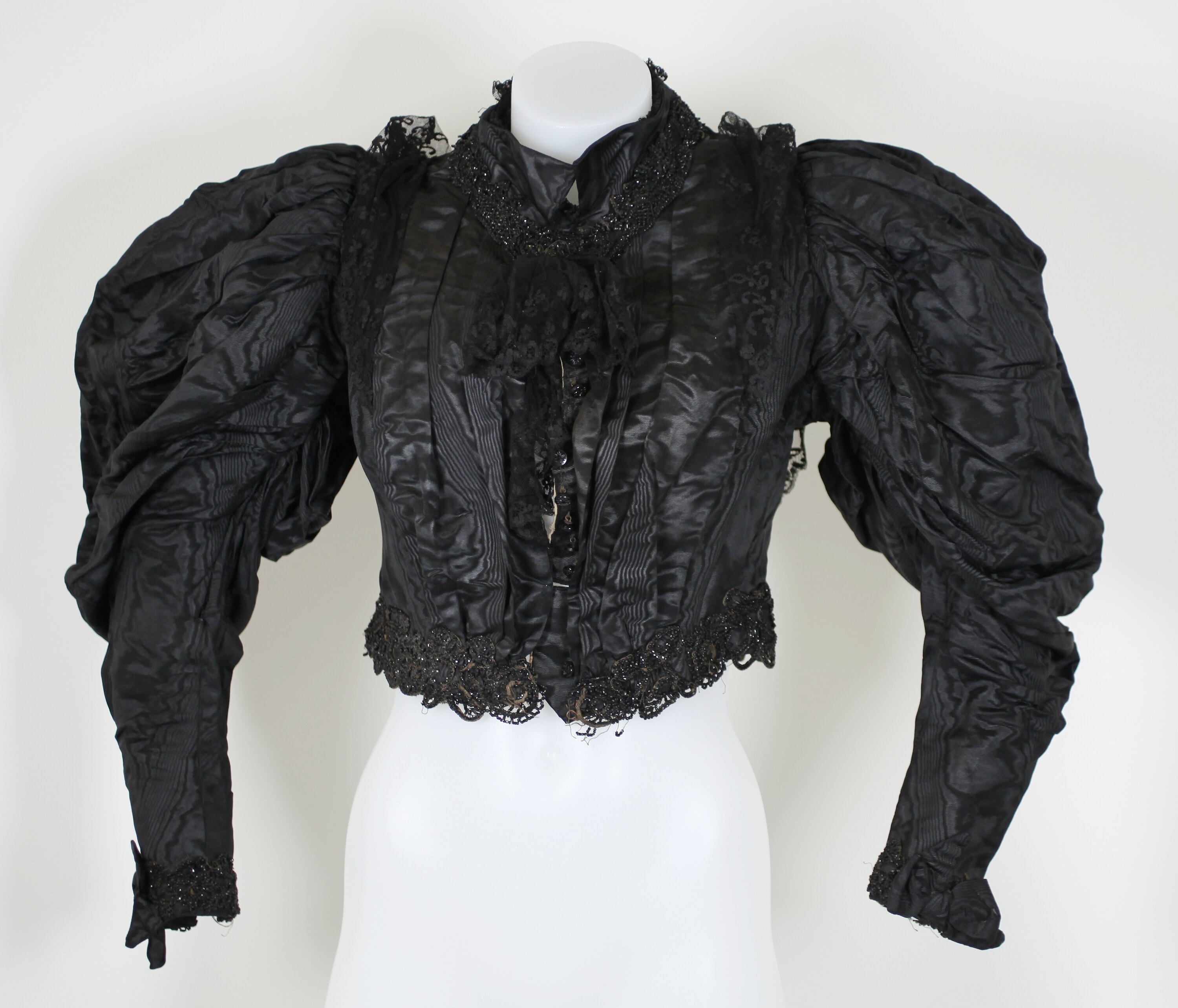 Black moire beaded bodice with stand-up collar. The bodice was thought by the donor to have been worn around 1880, and would have had a matching skirt. The date, however, seems too early, as the leg-o-mutton style sleeve was popular in the mid-1890s.