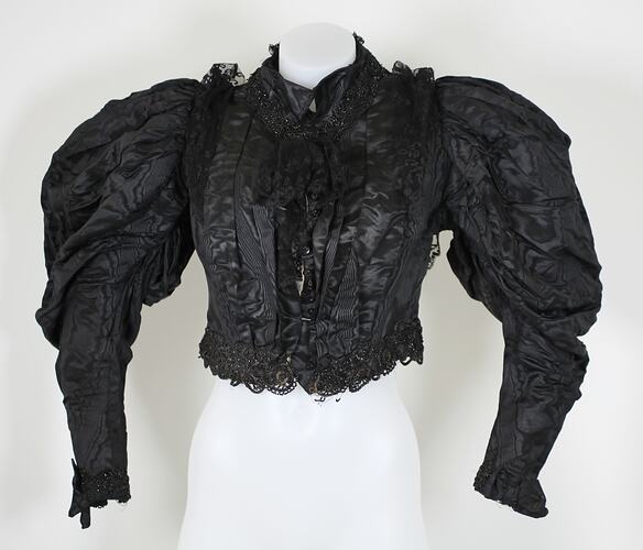 Black moire beaded bodice. High collar with lace trimming inside and beaded trim outside. Front fastening with 10 buttons of black glass with metal shanks. Long leg-of-mutton sleeves with bow and beads at wrist. Black lace, machine-made, fill-in at front collar opening and lace overlays on sleeve tops, running down along back centre panel seams. Bodice veed at centre-front and centre-back. Darted bodice, lined with striped, patterned cotton and re-inforced with 12 whalebone stays - although 4 are missing or have been removed for comfort.