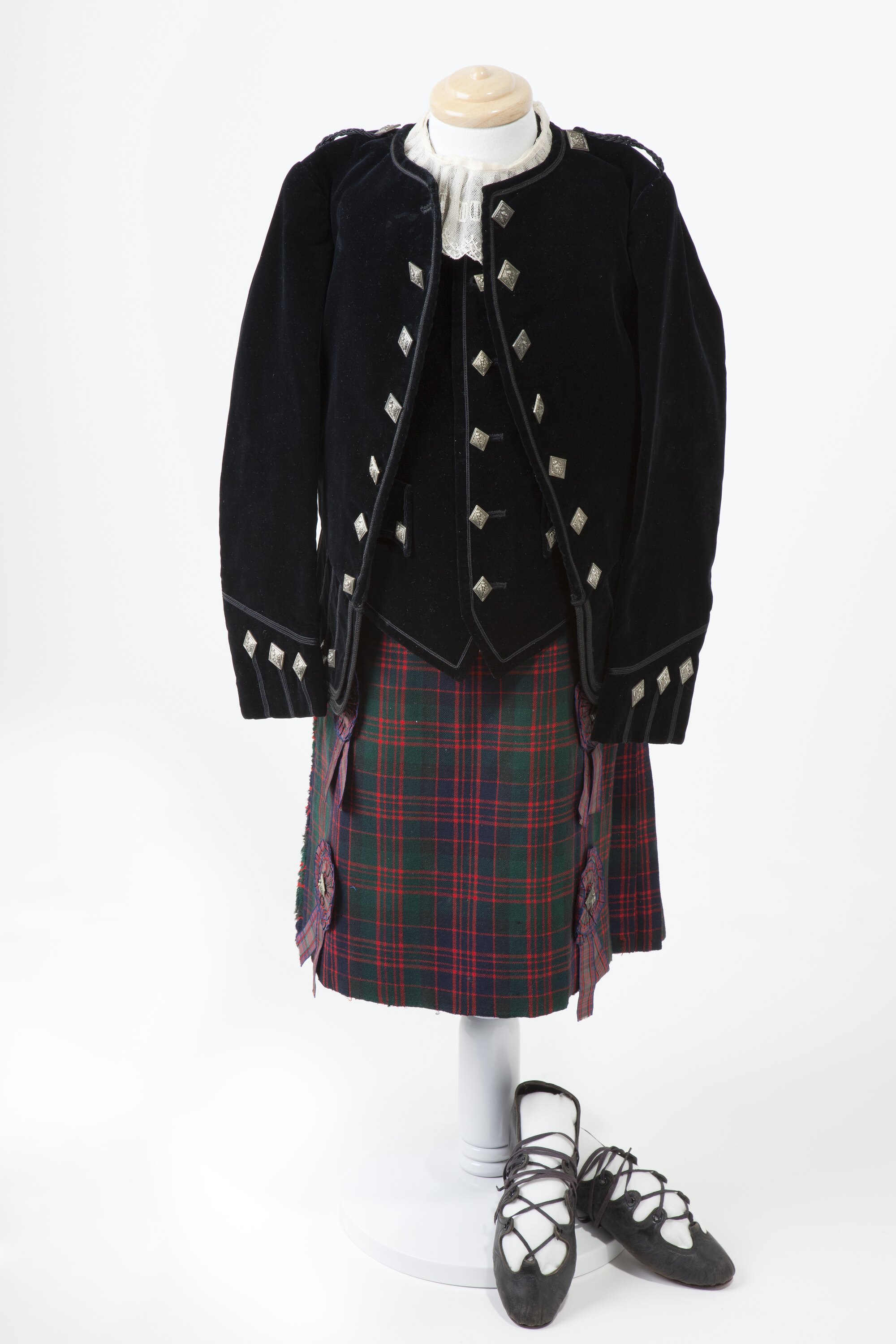 Child's costume consisting of: 1: Tartan ribbons; 2: Tartan kilt in McDonald tartan, with silk lining around waist, four ribbon rosettes held onto the front of the kilt by four diamond-shaped silver buttons with a thistle emblem on each. Made by Scovell and Spurling Pty Ltd, Footscray; 3: Fitted black velvet jacket, cord trim on sleeves, neck, pockets and front opening, braided cord across the shoulders, diamond-shaped buttons. Made by Scovell and Spurling Pty. Ltd., Footscray; 4: Black velvet waistcoat with silver-coloured diamond-shaped buttons; 5: Plaid tartan shawl in, McDonald tartan; 6: Pair of tartan woollen socks; 7 Lace collar with scalloped edges and rectangular inserts; 8: Bonnets with traditional badge and magpie feather; 9: Pair of black leather Scottish dancing shoes.