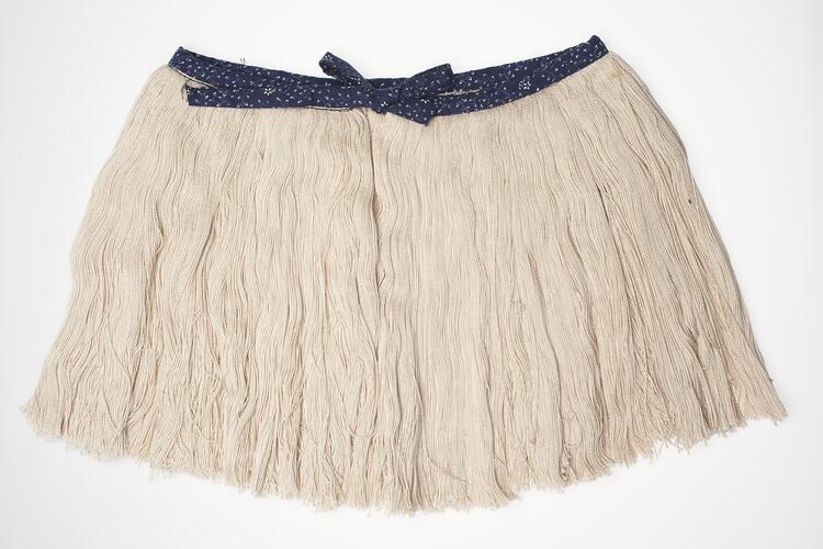 Skirt of unbleached manufactured cotton fibre consisting of a thick fringe sewn into a narrow waistband of dark blue and white printed cotton fabric. The waistband is extended and fastened by tying in a bow. The cotton fringe is cut to a uniform length.