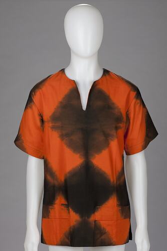 Cotton shirt, tie-dyed in orange and black diamond pattern. The shirt is loose-fitting, short-sleeved and collarless, with the neckline slit at the front and lined. Two patch pockets are attached at the hem, just in front of the side seams.