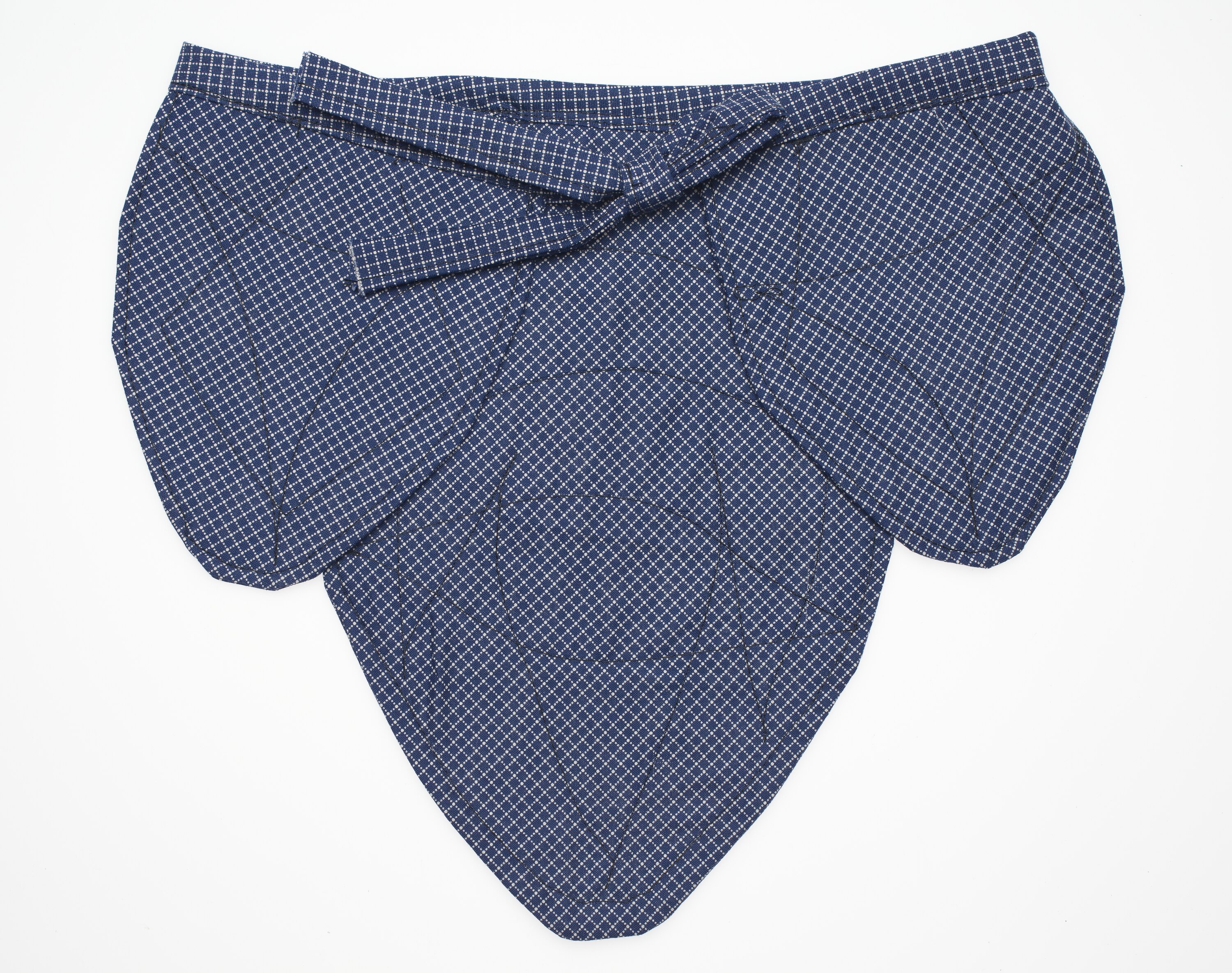 Apron-like garment consisting of three stiffened, lined flaps of fabric attached to a narrow waistband which is fastened by tying the ends together. Made from cotton fabric printed in dark blue with white dotted check pattern. The central flap is larger than the other two; all three are mitre- shaped and reinforced by sewing a pattern in black cotton across them.