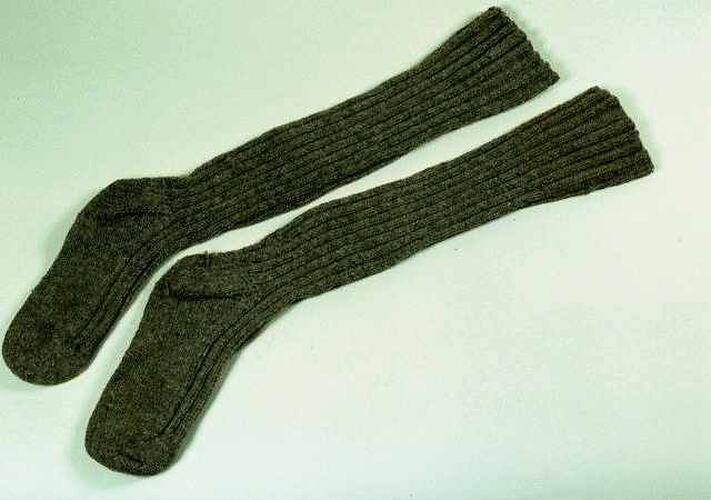 Pair of grey wool socks, Navy issue. They were used by ANARE Director Phil Law on the vessels Wyatt Earp and the Labuan between 1947 - 1951. They were for shipboard use only and not used much as they were clumsy to use and to launder.