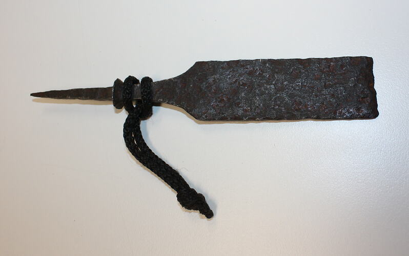 Burned and rusted reamins of a chisel with a knotted rope attached.
