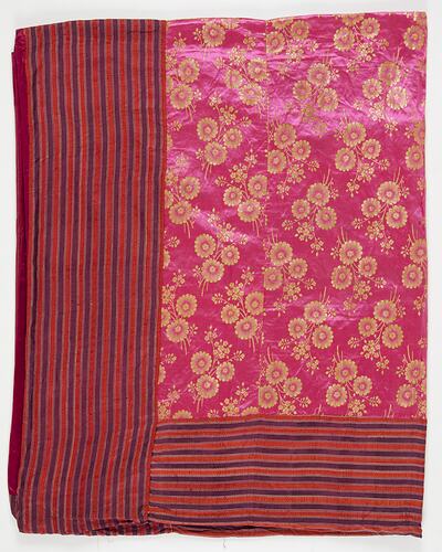 Silk bedspread with a gold floral pattern on a bright pink background, with red and deep purple striped border.