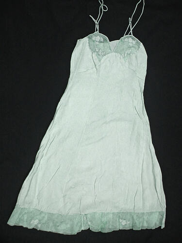 Lingerie set consisting of a slip and underpants made of light blue crepe. The slip has two thin straps on either side of the bodice. It has a V-shaped neck with two panels of netting which have blue crepe flowers and leaves embroidered on them. The lower hem of slip is also of netting with blue crepe flowers attached. There is a buttoned opening at the left side of the slip. The knickers have an elasticised waist band across the back only. The outer side panels of the knickers have a net panel with blue crepe flowers and leaves embroidered onto it. The front of the knickers have a panel with gathering and a side button opening on left side.