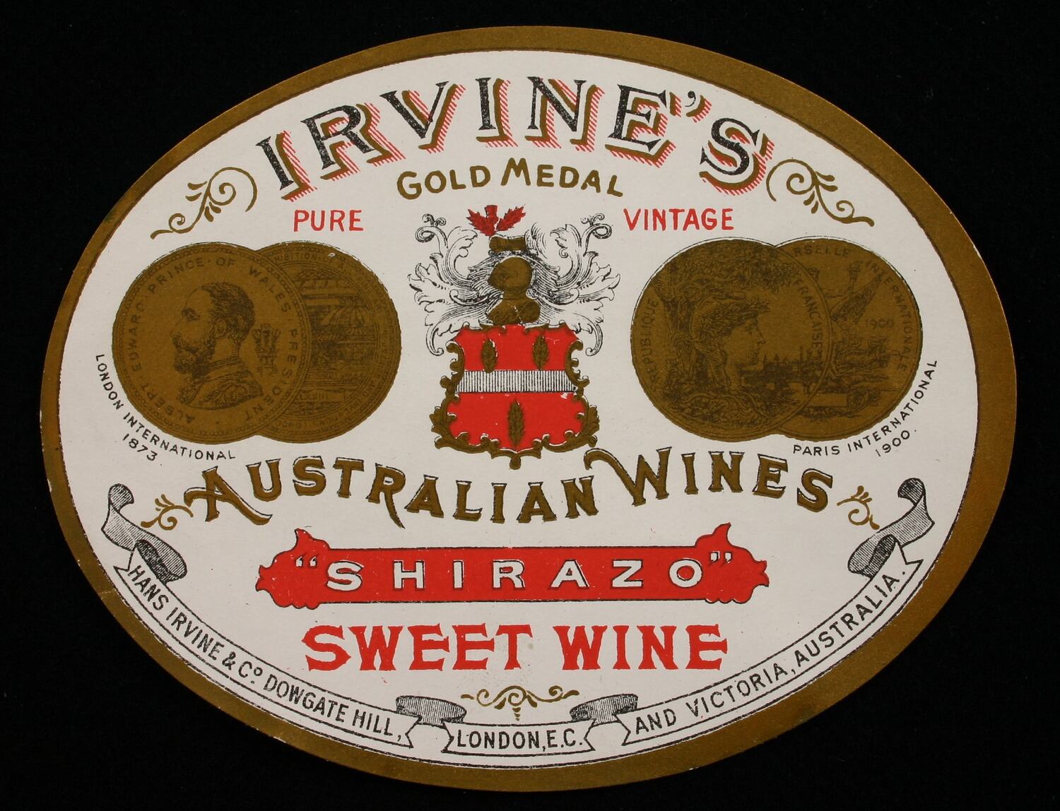 Text: IRVINE'S/GOLD MEDAL/PURE VINTAGE/LONDON INTERNATIONAL/1873/PARIS INTERNATIONAL/1900/AUSTRALIAN WINES/SHIRAZO/SWEET WINE/HANS IRVINE & Co. DOWGATE HILL, LONDON E.C. AND VICTORIA, AUSTRALIA.