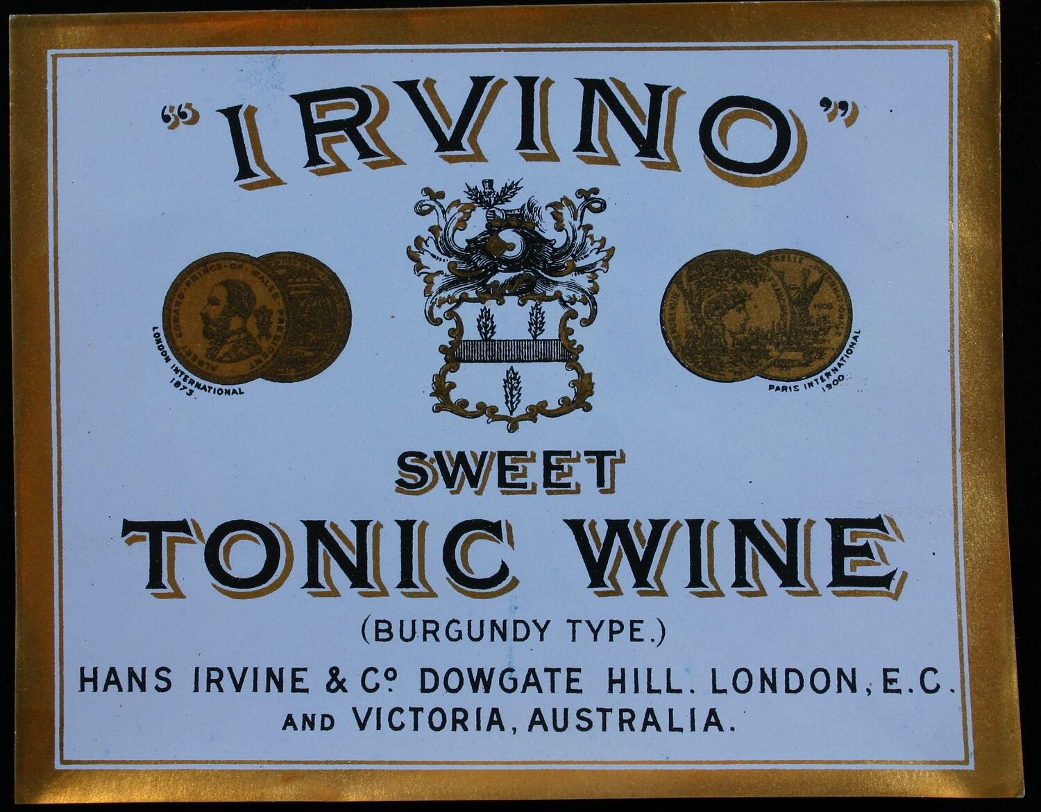 Text: "IRVINO"/LONDON INTERNATIONAL /1873/GOLD PARIS INTERNATIONAL/1900/SWEET/TONIC WINE/ (BURGUNDY TYPE.)/HANS IRVINE & Co. DOWGATE HILL. LONDON, E.C./AND VICTORIA, AUSTRALIA.