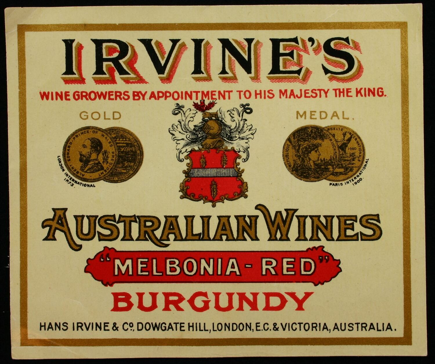 Text: IRVINE'S/WINEGROWERS BY APPOINTMENT TO HIS MAJESTY THE KING/GOLD MEDAL/LONDON INTERNATIONAL/1873/PARIS INTERNATIONAL/1900/AUSTRALIAN WINES/ MELBONIA-RED/BURGUNDY/HANS IRVINE & Co., DOWGATE HILL, LONDON, E.C. & VICTORIA, AUSTRALIA.