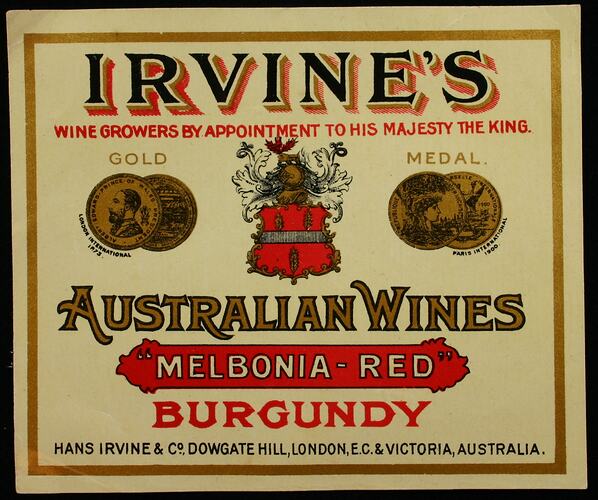 Wine label is printed in black, gold and red ink and reads: "Irvine's winegrowers by Appointment to His Majesty the King gold medal London International 1873 Paris International 1900 Australian Wines Melbonia-Red Burgandy. Hans Irvine & Co. Dowgate Hill. London, E.C. and Victoria, Australia".