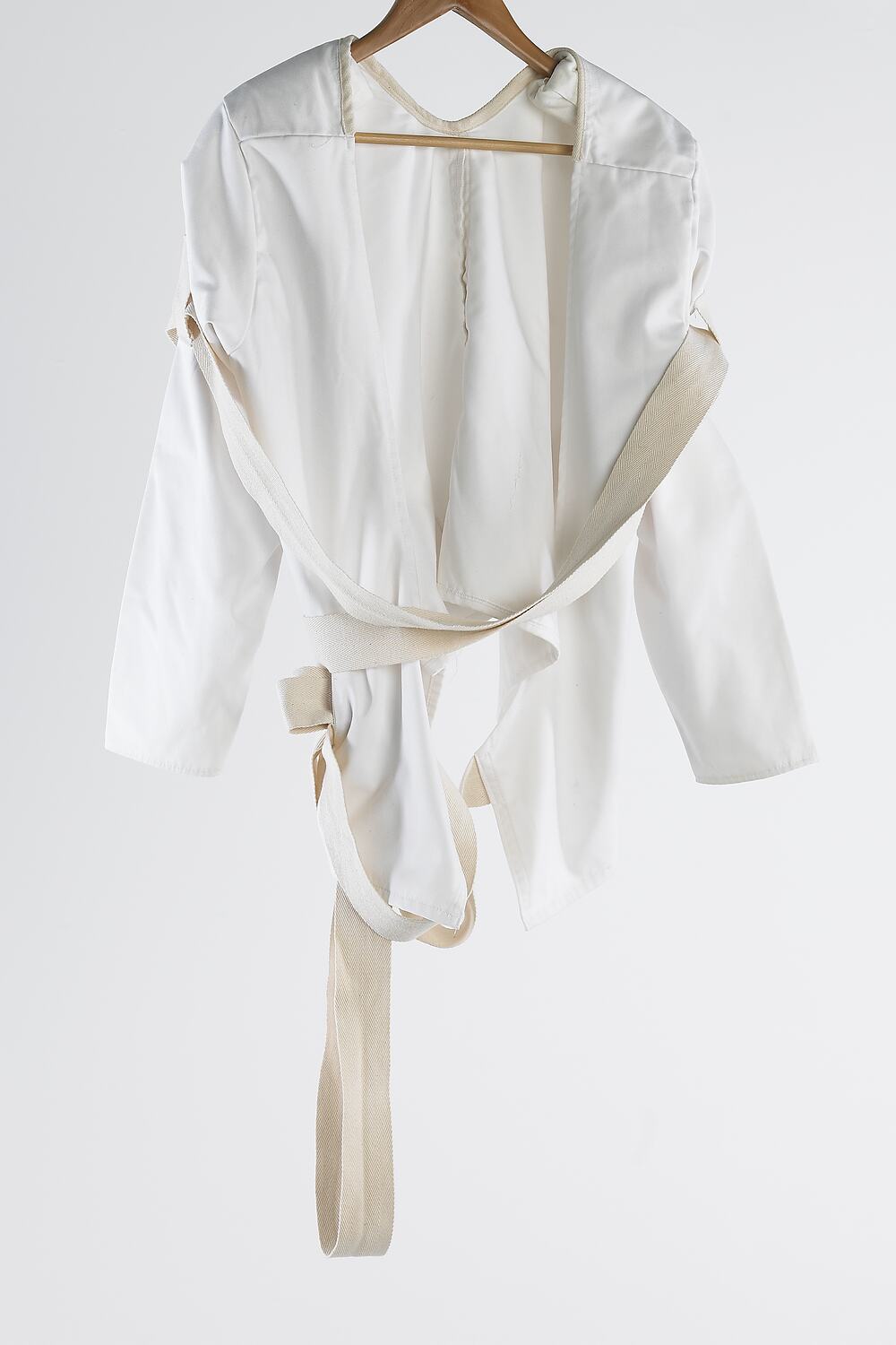 Cotton straitjacket made in 1992. This restraining device was made at Mont Park Sewing Room, at Mont park, a mental health hospital in Bundoora, Victoria. This straitjacket is an example of restraints used and made in psychiatric hospitals in Victoria, Australia.