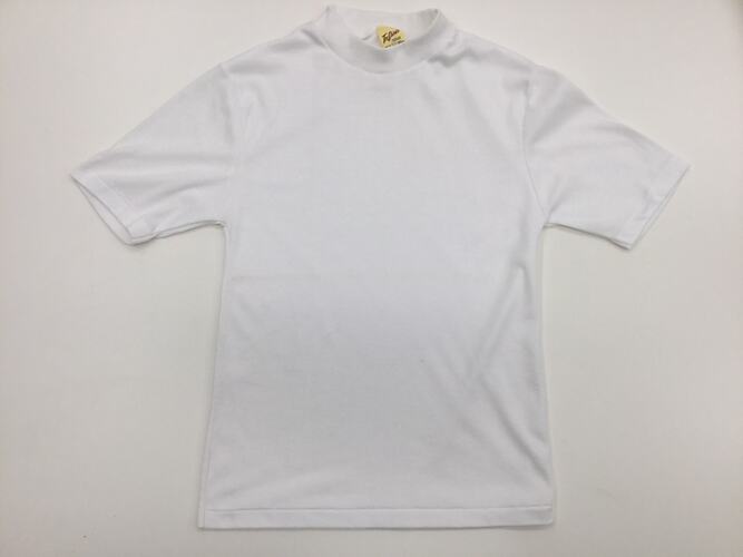 A white machine-knitted t-shirt with high crew neck. The lower edge has a 20mm hem turned up. A 34mm wide ribbed band around the neckline. The set in sleeves are 120mm long and have a band 22mm wide turned in and sewn down.