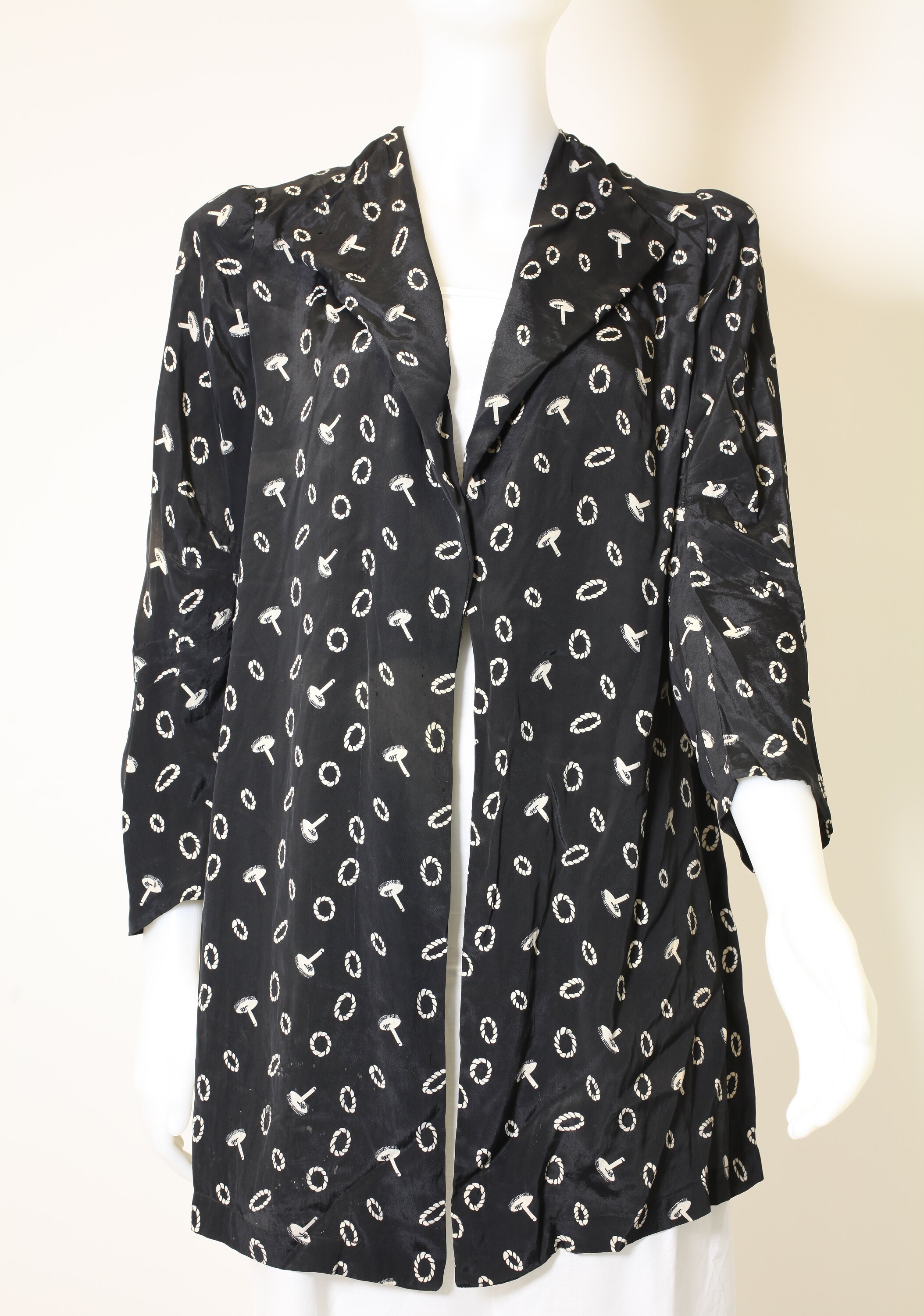 Black silk long lightweight jacket with white quoit pattern. Jacket cut long and straight with revers at lapel. Shaping at nape(back of neck) through seven darts. Two single shoulder darts at front. Three quarter length shaped sleeves with 6 small darts on the inner elbow. Hook/eye closing at front. Shoulder pads attached at top of sleeve.