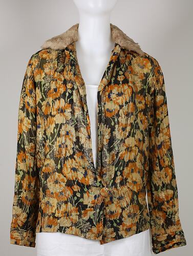 Evening jacket of floral printed silk georgette with overwoven floral design in gold metallic thread. Orange fawn stylised poppy design. Has green stems and buds blue centres on black background. Straight style with front opening closed with one self-covered button and material loop at waist. Set in sleeves ending in slightly gathered cuff, finished at wrist with narrow band and flat bow. Collar faced with beige fur, possibly. Jacket lined with bright yellow georgette finished with self ruching. Small pocket on RHS finished with ruching edges. Sleeve lining has had yellow satin ribbon added to cuff.