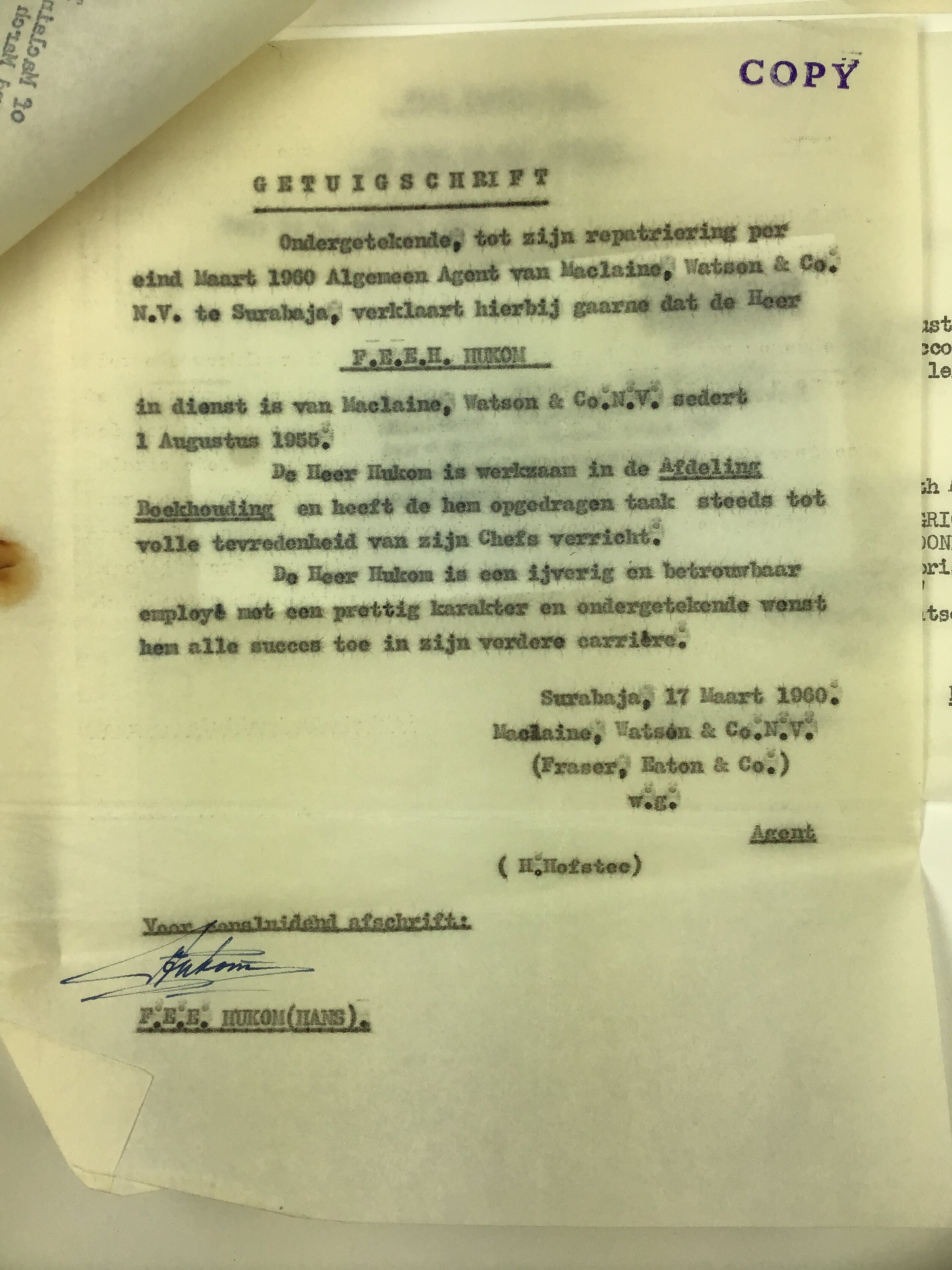Record of employment (in Dutch) of Hans Hukom as a bookkeeper with Maclaine, Watson & Co, Surabaya, Indonesia from 1 August, 1955. The document is dated 17 March 1960 and has been supplied for reference purposes.
