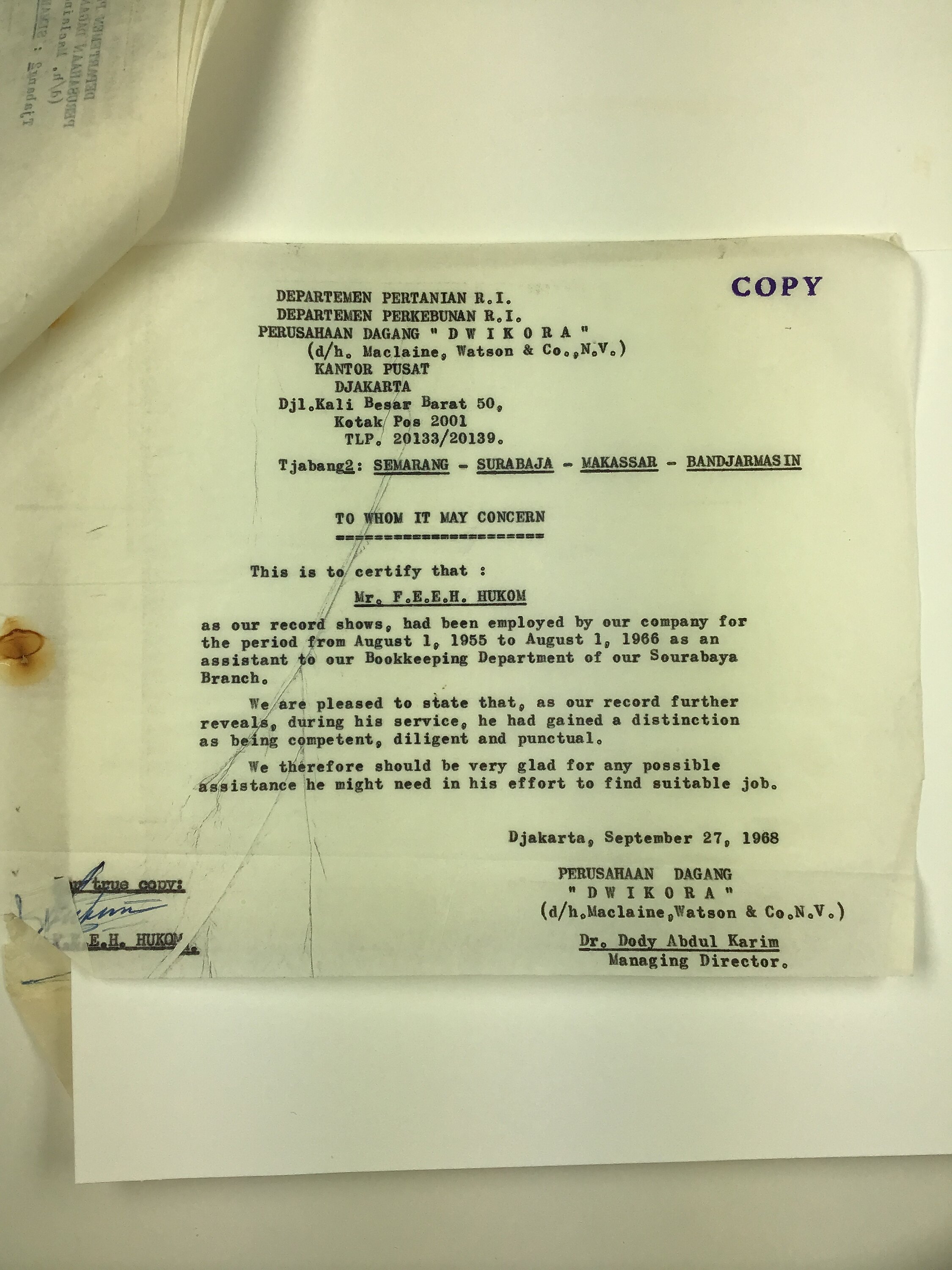 Copy of record of employment of Hans Hukom as a bookkeeper with Surabaya Branch, Jakarta, Indonesia from 1 August, 1955 to 1 August 1966. The document is dated 27 September 1968 and has been supplied for reference purposes.