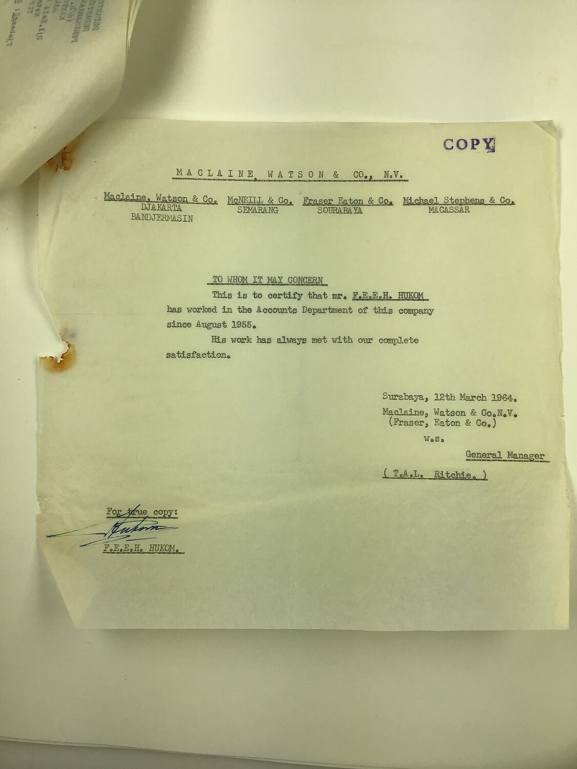 Copy of record of employment of Hans Hukom in Accounts Department at Maclaine, Watson & Co., Surabaya, Indonesia since August, 1955. The document is dated 12 March, 1964 and was supplied for reference purposes.