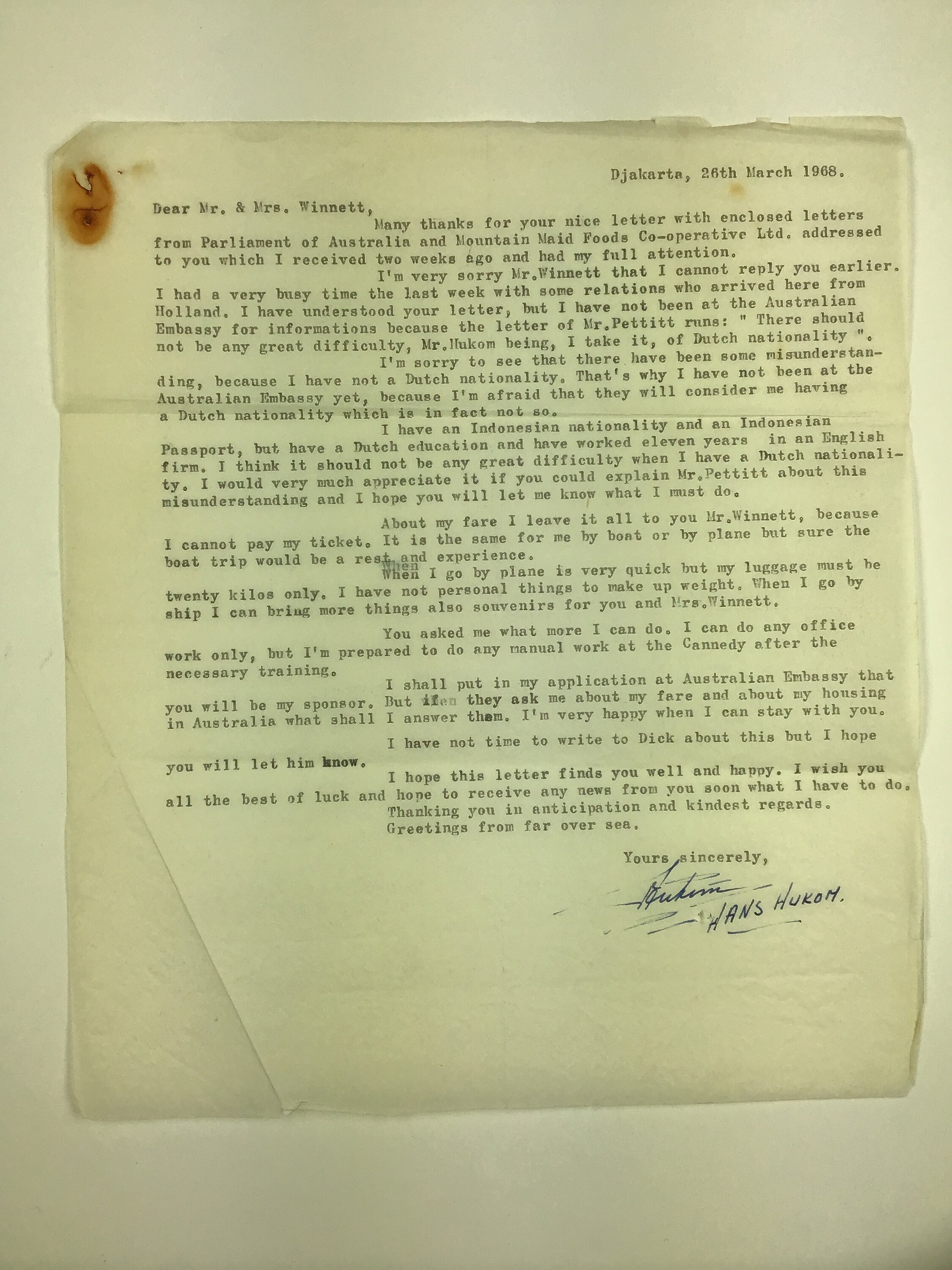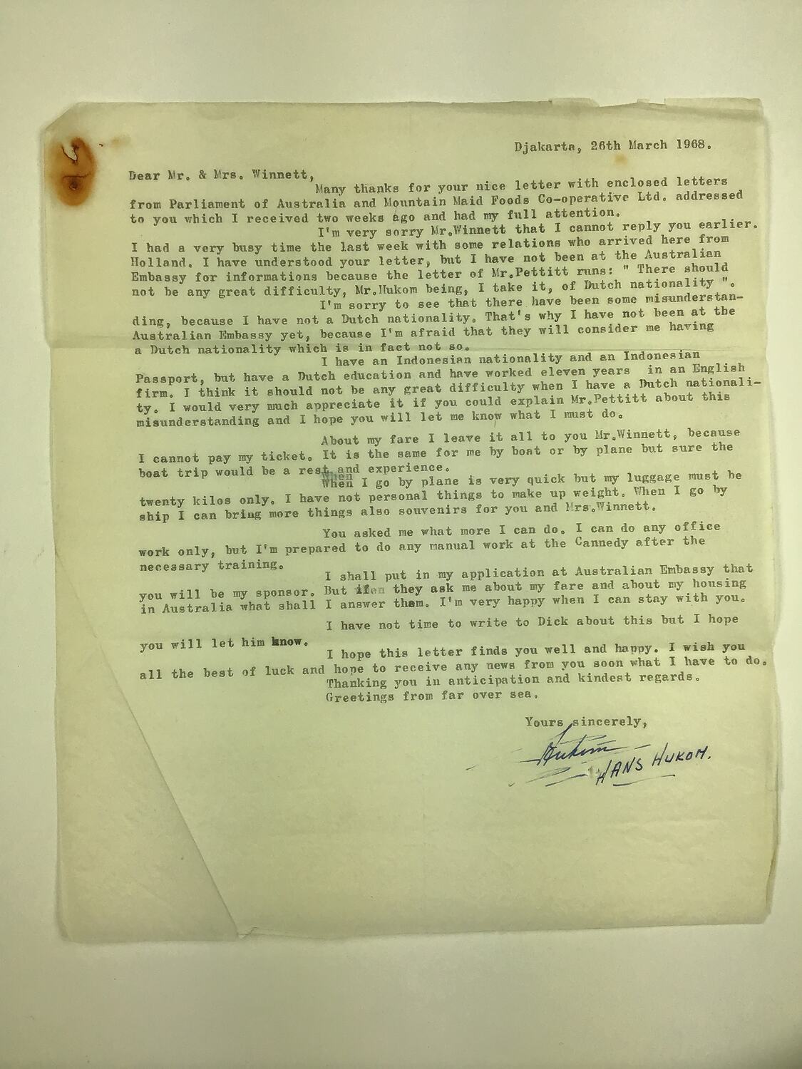 Letter from Hans Hukom in Jakarta, Indonesia to Richard and Edith Winnett in Gundagai, New South Wales, dated 26 March, 1968. Hans expresses his concern that having Indonesian rather than Dutch nationality will make his Australian immigration application more difficult - despite his Dutch language and education. He requests assistance from the Winnetts with his fare, and that he will nominate the Winnetts as his sponsor in his application.