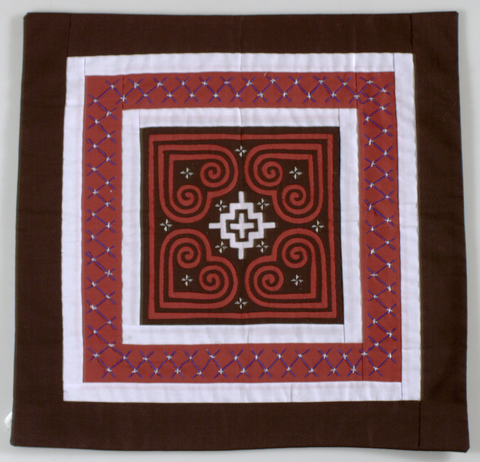 Cushion Cover made by members of the Hmong community in Victoria, circa 1991 - 1992. The Victorian Hmong community developed after many Hmong fled from Laos in 1975 and arrived in Australia in mid 1980s after spending time in Thai refugee camps. The women of the Victorian Hmong community produced and sold these types of works at the Fitzroy Craft Market to supplement family income.