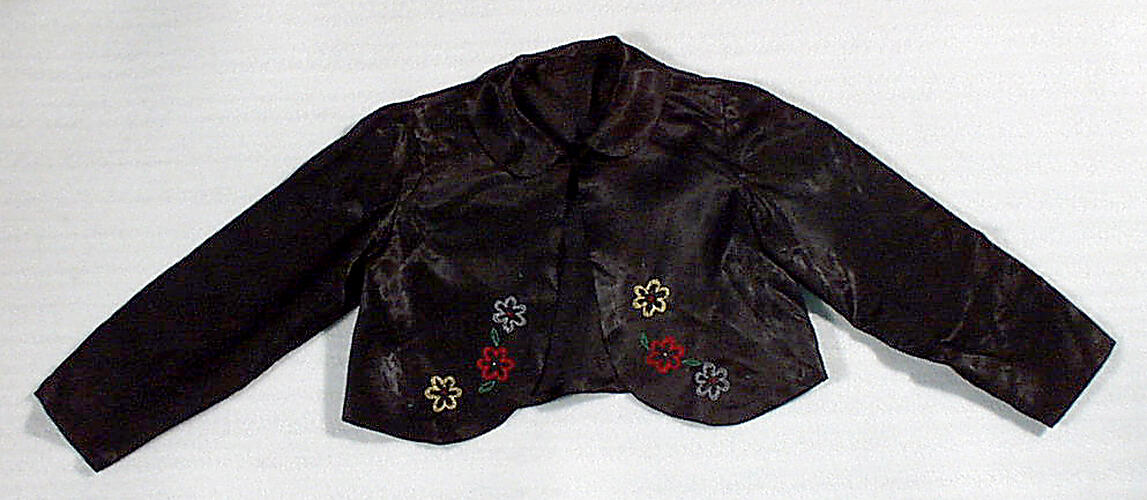 Small satin bolero jacket, which appears to be made from a synthetic fabric. Red, yellow, green and blue flowers have been hand embroidered with coloured thread on the front of the jacket.