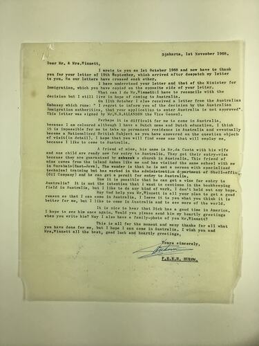 Letter from Hans Hukom in Jakarta, Indonesia to Richard and Edith Winnett in Gundagai, New South Wales, dated 1 November, 1968. He thanks the Winnetts for their letter dated 19/9/68 which arrived after his letter of 1/10/68 and which included the Department of Immigration letter, presumably rejecting his application. He refers to a letter from the Australian Embassy dated 11/10/68, also informing him of the failure of his application.