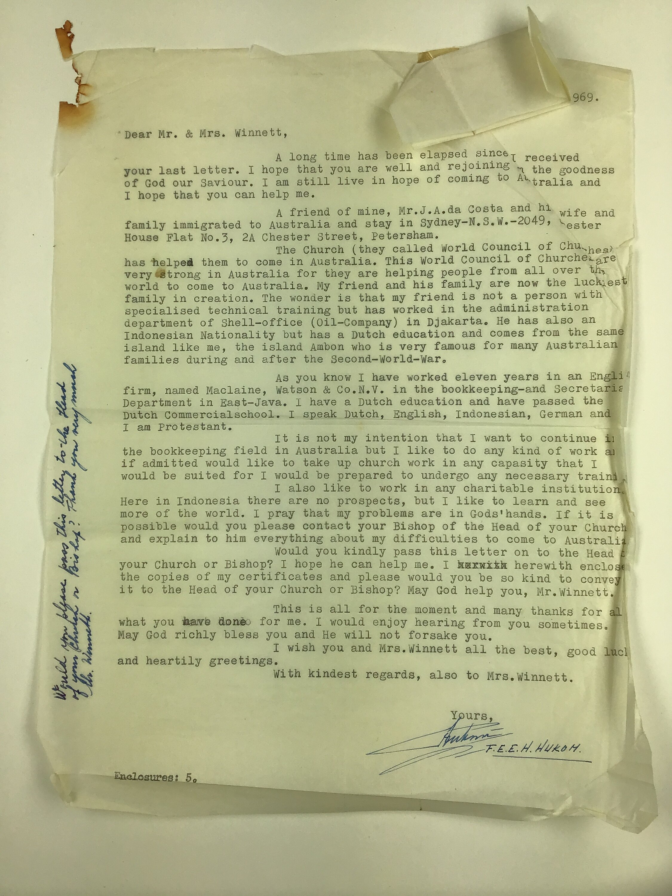 Letter from Hans Hukom in Jakarta, Indonesia to Richard and Edith Winnett in Gundagai, New South Wales, dated 20 June, 1969. He asks them to pass on this letter to the Bishop (referred to in letter HT 57016). It included a small photo of Hans taken 13/2/69 (MM153597). Hans refers to the World Council of Churches who are helping people come to Australia, including the Costa family friends whom he believes are less qualified than him. It lists his work experience and qualifications, willingness to work for a charity, and ongoing hopes for the future.