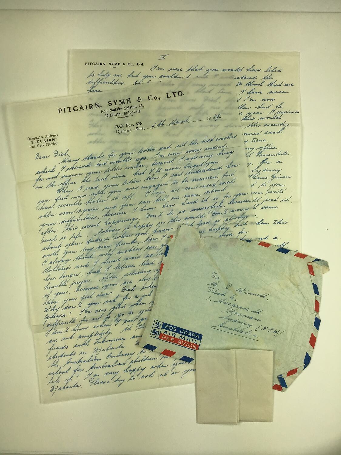 Two page handwritten letter to Dick (Richard) Winnett, son of Richard and Edith Winnett in New South Wales, from Hans Hukom in Jakarta, Indonesia, dated 4 March, 1967 (address c/o Pitcairn, Syme and Co. Ltd, Jakarta). Among other things Hans mentions he had put in an application for a Dutch visa, but had not heard back. He enclosed two small photos of himself with friends he said worked with him at the Greek Consulate in 1966 (HT153596 and HT153595).
