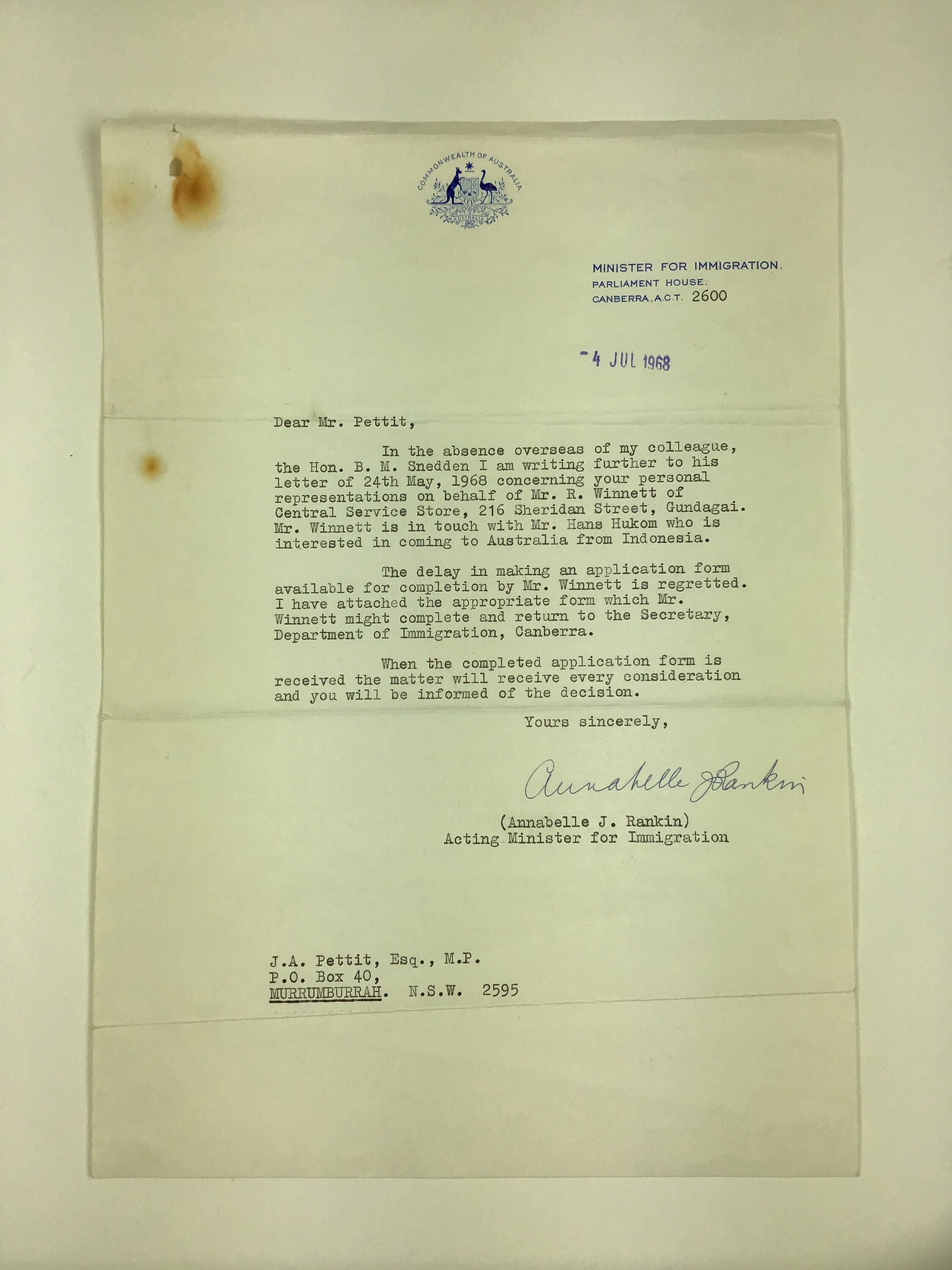 Letter on Commonwealth of Australia Minister for Immigration letterhead, from Annabelle Rankin, Acting Minister for Immigration to J.A. Pettit MP, Member for Hume, Canberra, dated 4 July, 1968, regarding a letter received on 24 May 1968 (HT 57024). It notes Pettit's representation on behalf of Richard Winnett in matter of Hans Hukom and the regrettable delay in making an application form available. The correct form is attached and Mr Winnett is advised it should be completed and return to the Immigration Department secretary for consideration.