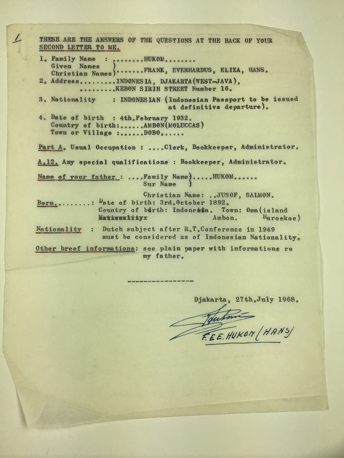 This is one of a collection of 40 documents and four photographs relating to the unsuccessful attempts by Hans Hukom, an Indonesian citizen, to migrate to Australia between 1968 and 1972.
