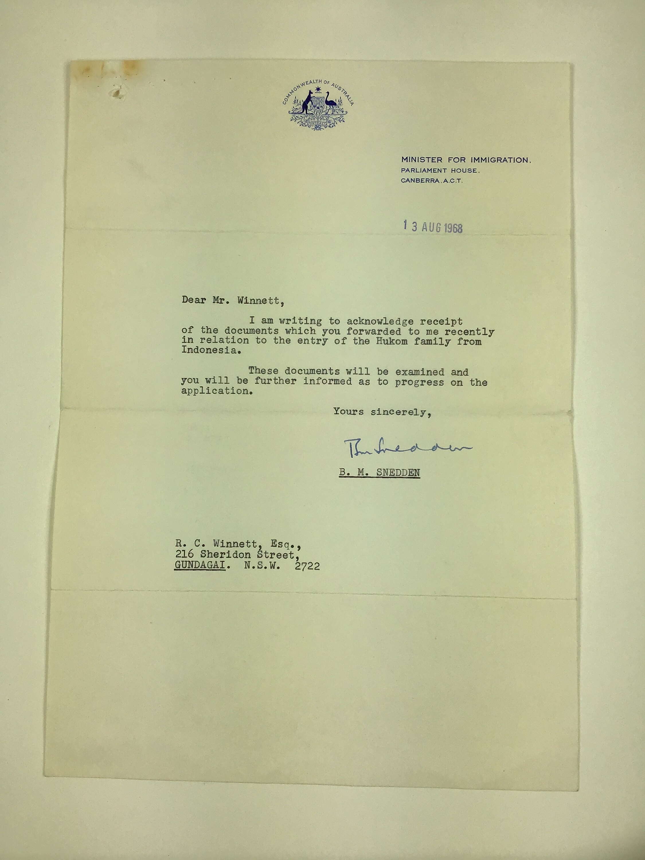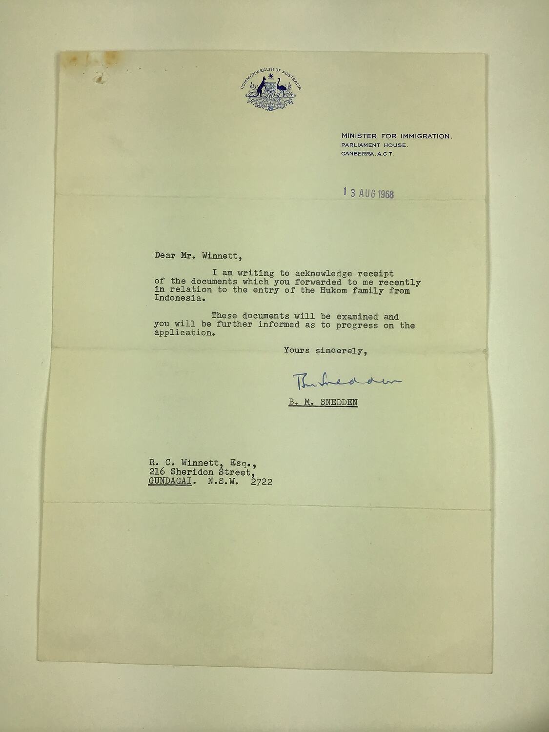 Letter on Commonwealth of Australia Minister for Immigration letterhead, from B.M. Snedden, Immigration Minister to Mr R.C. Winnett, acknowledging receipt of documents regarding the entry to Australia of the Hukom family from Indonesia, and to progress reports on the application. The letter is dated 13 August, 1968.