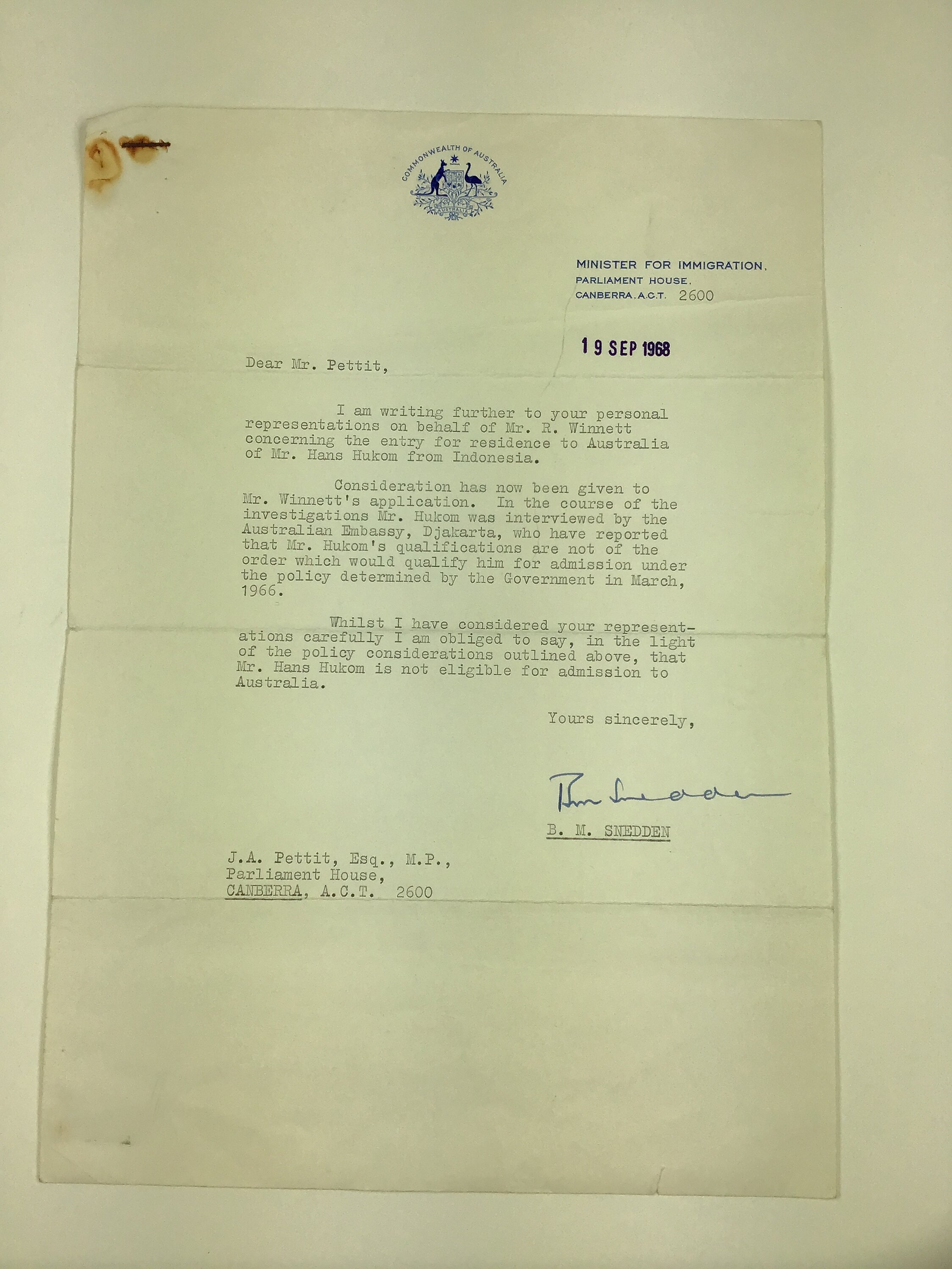 Letter on Commonwealth of Australia Minister for Immigration letterhead, from B.M. Snedden, Immigration Minister to J.A. Pettit MP, Member for Hume, Canberra, dated 19 September, 1968. The letter is regarding Snedden's representations on behalf of Mr Richard Winnett concerning Hans Hukom's entry for residence to Australia. He explains that consideration to the application has been given, that Hans has been interviewed by the Australian Embassy in Jakarta and that his qualifications 'are not of the order which would qualify him for admission under the policy determined by the Government in March, 1966.' And that therefore Hans has been deemed ineligible to immigrate.