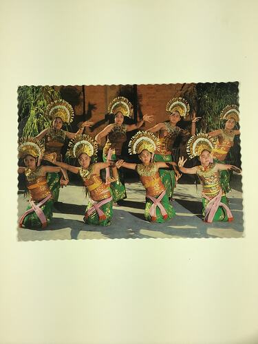 Colour postcard featuring Balinese dancers