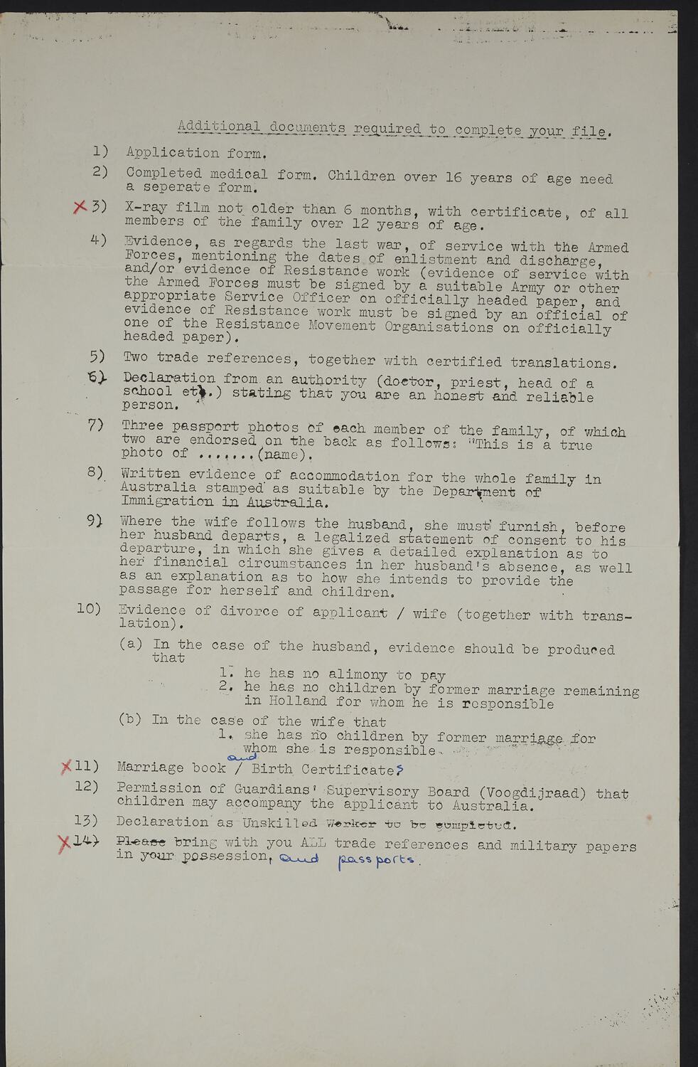 Notice (in English) probably from the Australian Department of Immigration titled 'Additional documents required to complete your file' which lists a series of documents including an application form, medical forms, x-ray films (which has been marked in pen with a cross), military service evidence, trade and personal references, passport photos, and evidence of accommodation in Australia.
