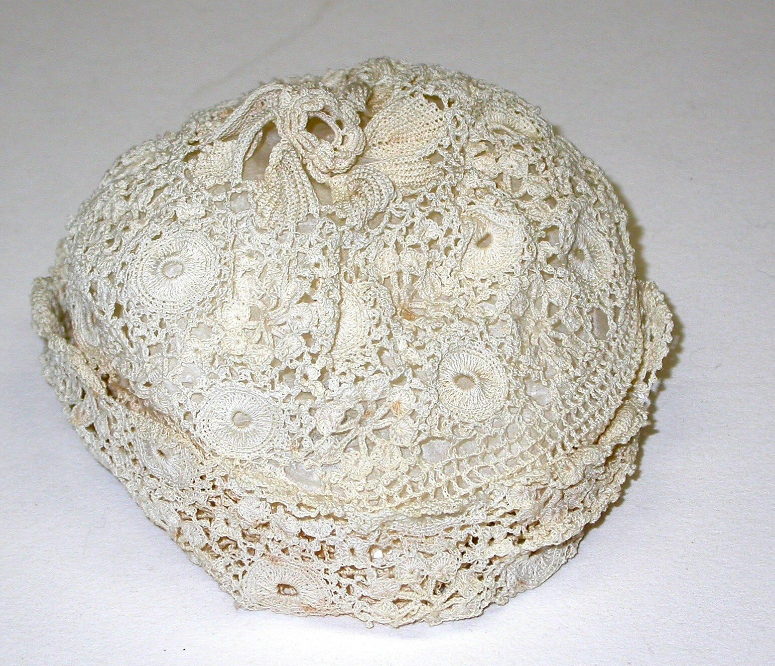 Baby's bonnet, cream, crotcheted, with turned-up brim. Rose and petals on crown, and decorative pattern on sides.