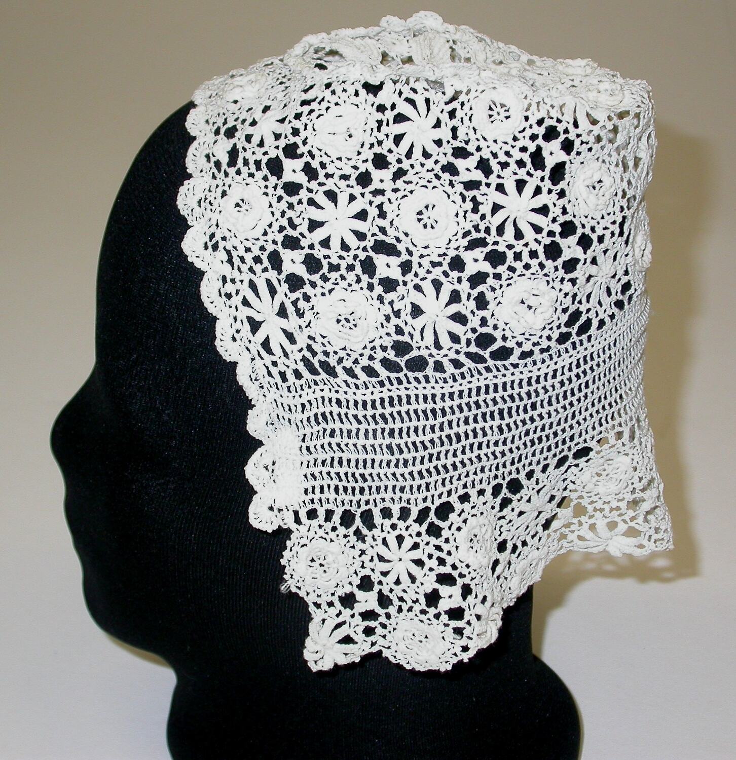 Bonnet, infant's, crocheted roses on sides and crown, cut away at front, sides and back same length, larger rose on crown.