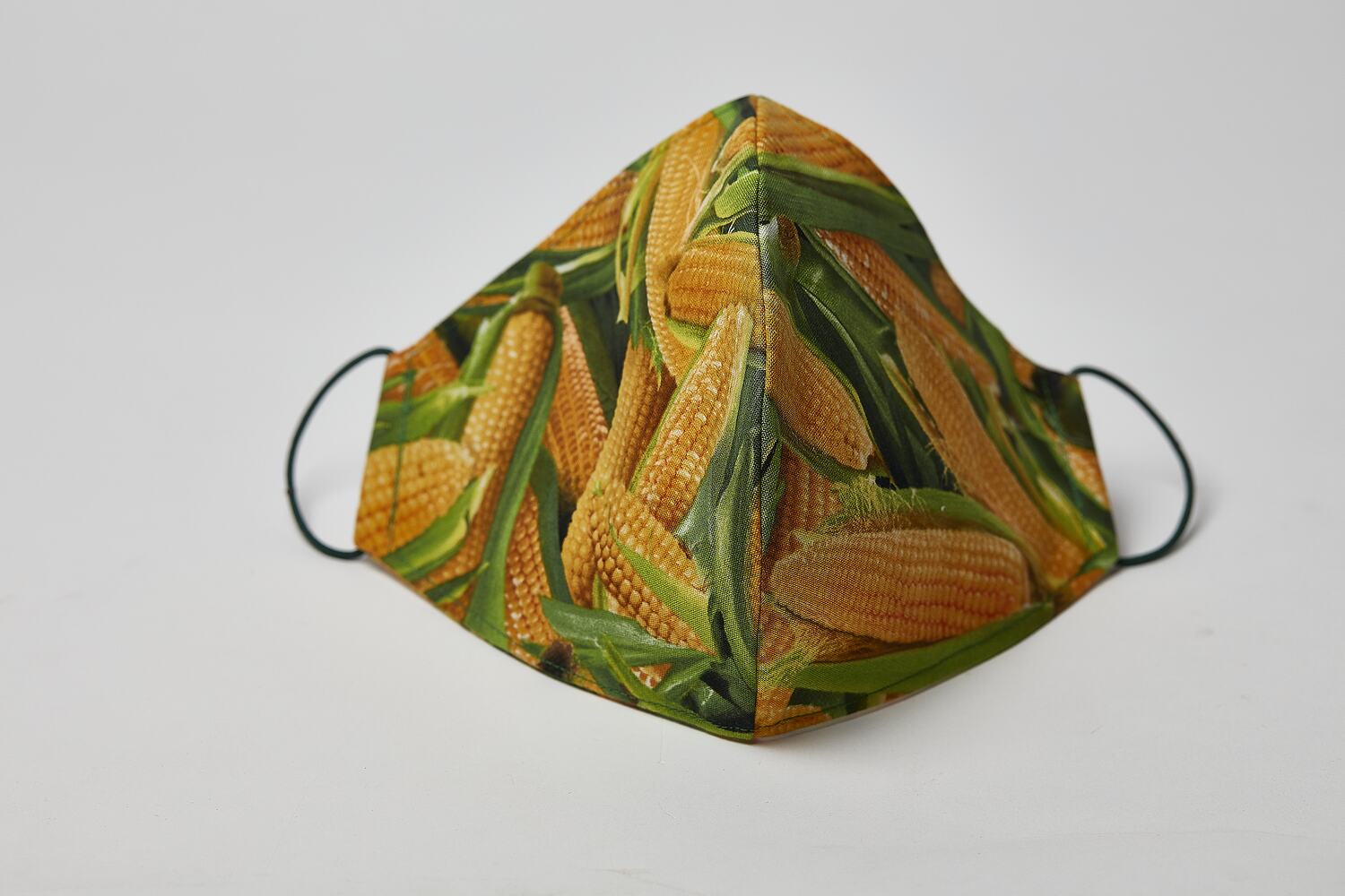 Cotton fabric face mask with sweet corn print and dark green elastic ear loops (hair ties) at each end. Two layer with same print on the inside.