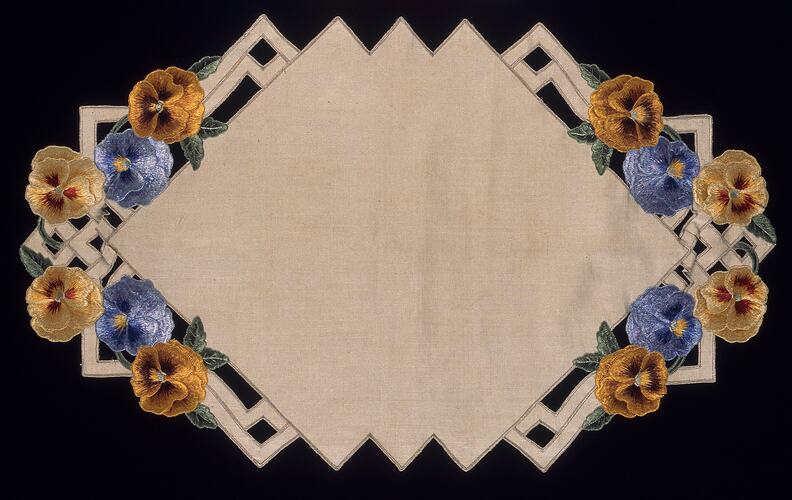 Table centre of cream linen. Cream buttonhole stitch around edges. Cut away. Zig zag shape with cut work silk embroidered pansies of blue and yellow in satin stitch and leaves in satin and stem stitch.