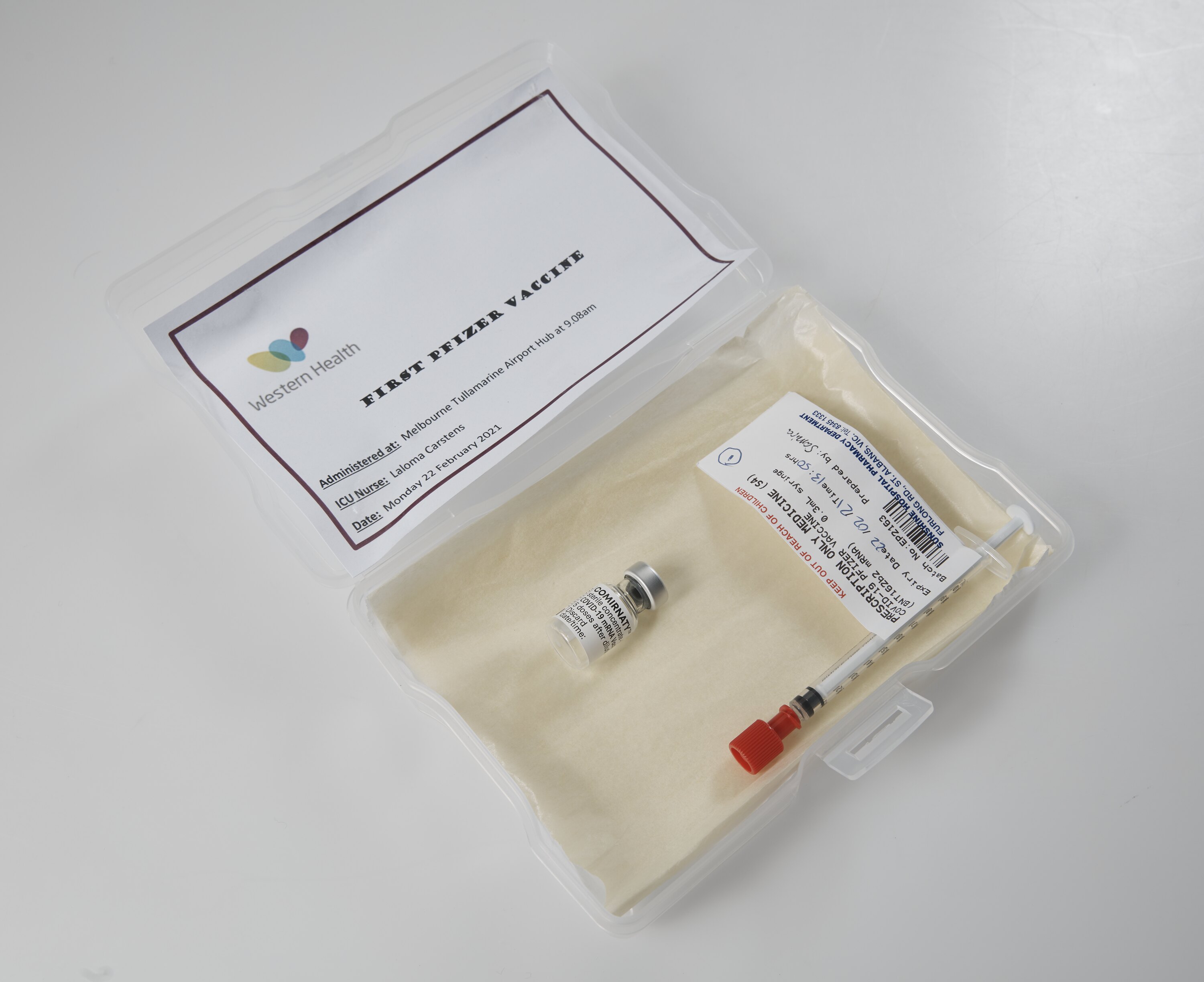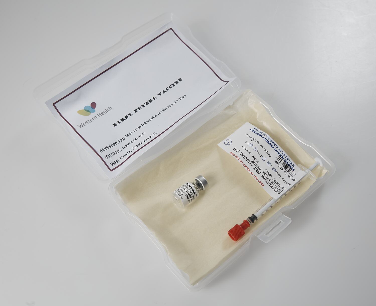 Syringe used to administer the first COVID-19 vaccination at the Melbourne Airport Vaccination Hub run by Western Health. It was administered at 9:08am on Monday 22 February 2021 at Melbourne Airport by Richard Bartolo, Manager of Infection Prevention at Western Health.