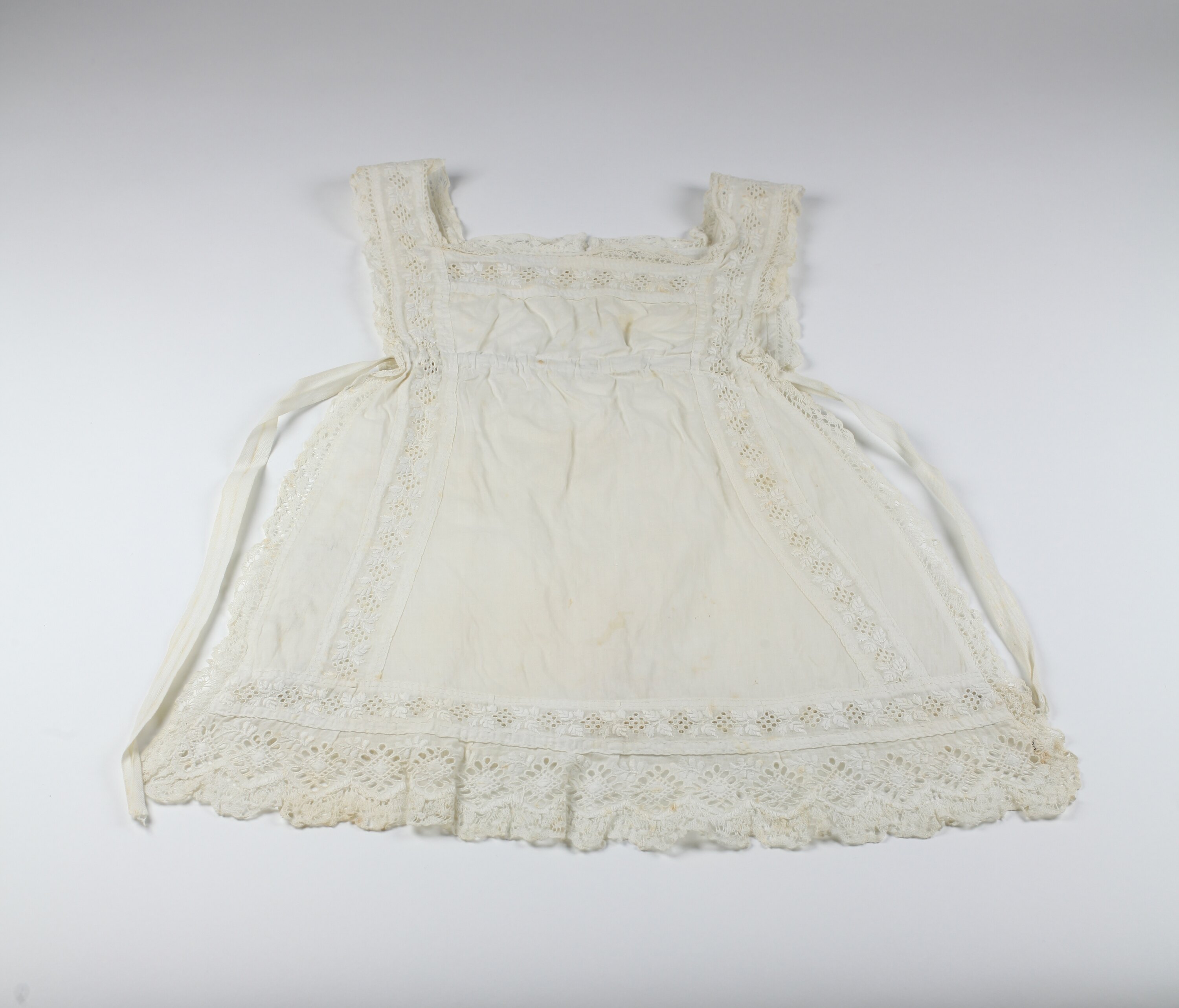 Infant or young child's pinafore of white cotton with broderie anglaise inserted panels and broderie anglaise trim on hem. Pinafore is then edged with bobbin lace. Pinafore has single shell button at back and cotton tape ties at front sides.