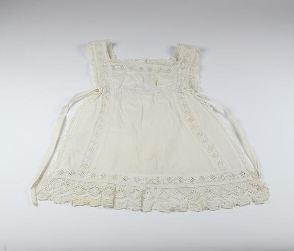 Infant or young child's pinafore of white cotton with broderie anglaise detail. Belonged to Betty Anderson, of 'Mynda', Molesworth Street, Kew.