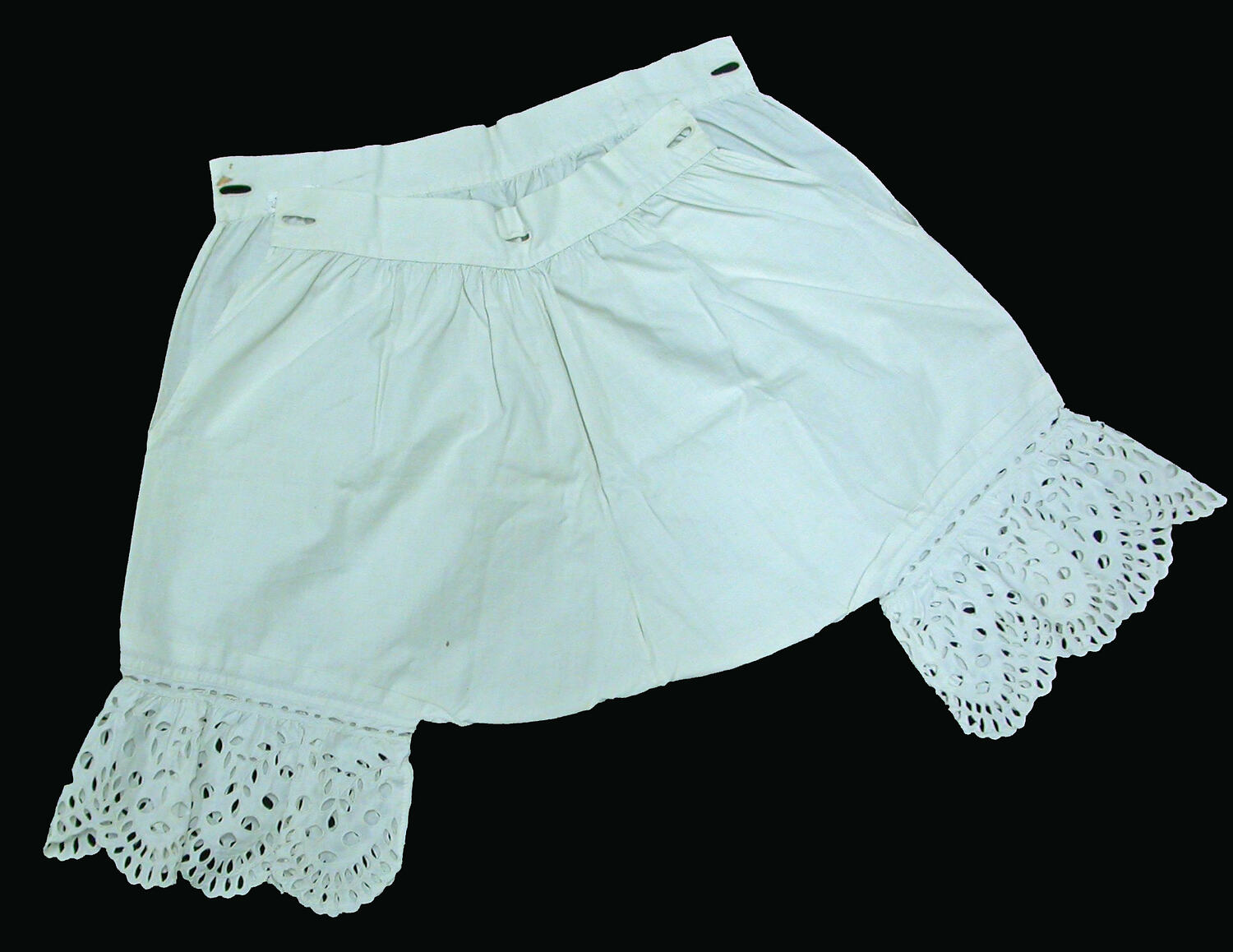 Child's off-white linen bloomers. Part of a small collection of clothing used at Emily McPherson College, Melbourne, as object lessons and/or demonstration works. They were made around 1940 by previous students of the college, handwork being an essential part of the course. The donor, Miss Findley, taught at the College.