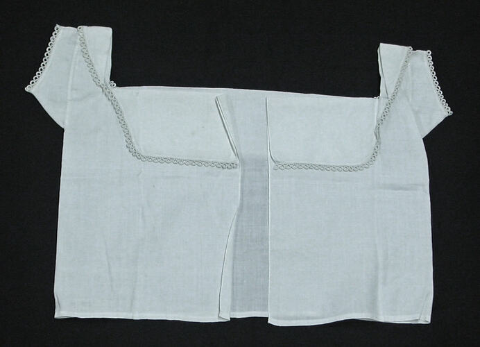 Unfinished child's chemise of fine white cotton. Part of a small collection of clothing used at Emily McPherson College, Melbourne, as object lessons and/or demonstration works. They were made around 1940 by previous students of the college, handwork being an essential part of the course. The donor, Miss Findley, taught at the College.
