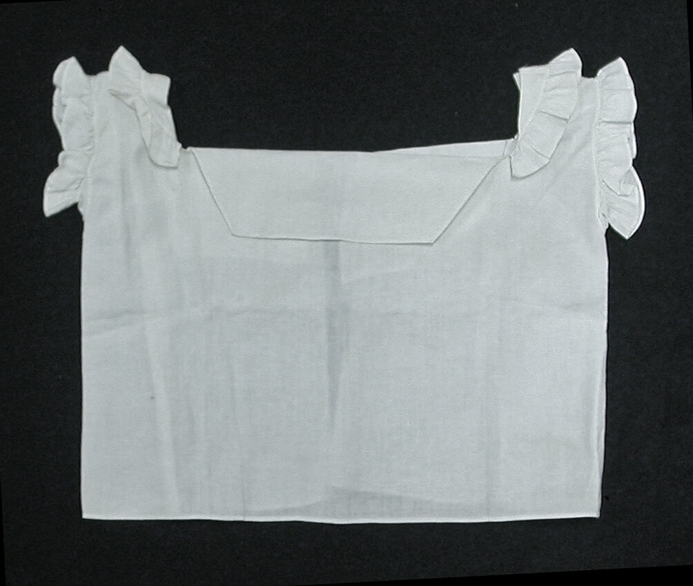 Unfinished child's undergarment sample of fine white cotton (one cataloguer describes as linen) with wide flat collar resembling a sailor collar. The garment has flounces around the armholes and the top of the collar. Hems and seams are all finely stitched by hand and the back is left open and has no fastenings.