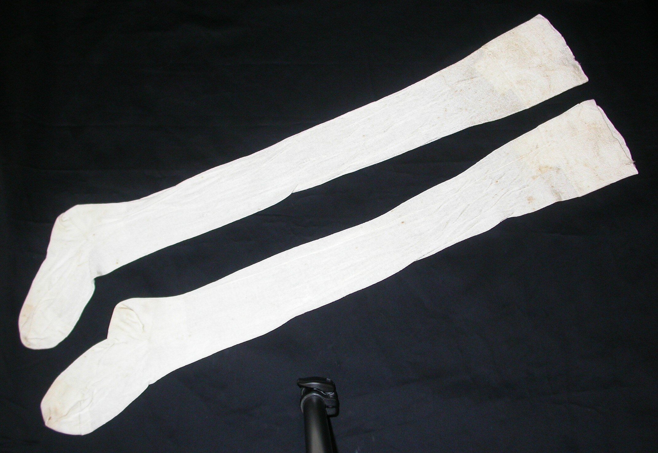 Pair of white stockings. The donor explained that they were sometimes worn as part of a Voluntary Aid Detachment uniform. They were identified as World War I-era, although she was a VAD during World War II.