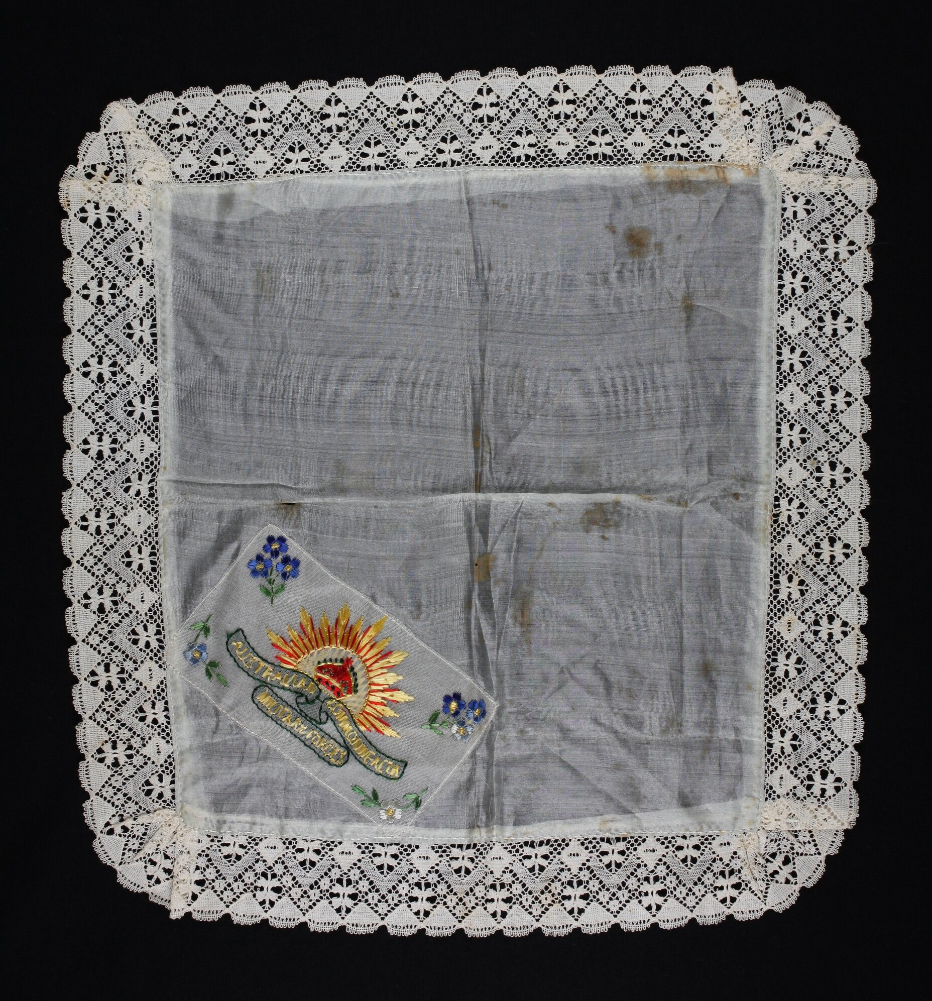 Square, pale blue silk handkerchief with cream lace border and hand embroidered design. The embroidered design is on a separate piece of rectangular fabric sewn onto the handkerchief. It depicts the Australian military emblem, i.e. a crown surrounded by radiating lines in yellow and red. Underneath the crown are 3 scrolls with embroidered transcriptions. The four corners of the design contain embroidered flowers in various shades of blue and white. The lace border is hand sewn in cream cotton.