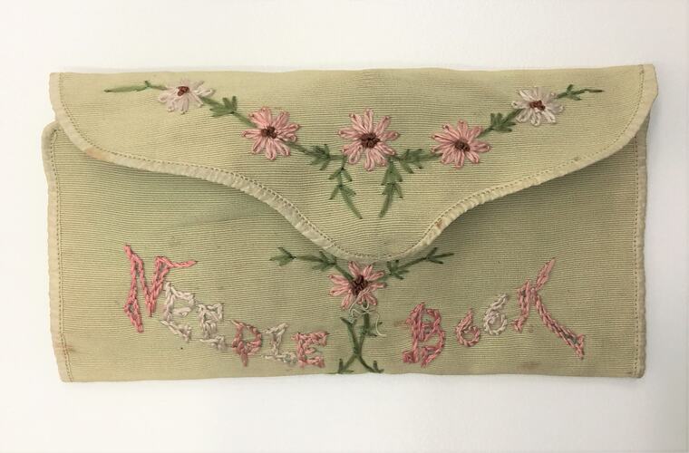 Hand-embroidered needlebook with thimble. Used by Mrs Vi Morgan, and likely made by her. Vi was a trained dressmaker who lived in South Melbourne from the late 1930s to the 1990s. She raised three children born during World War II, and was widowed shortly after the war.
