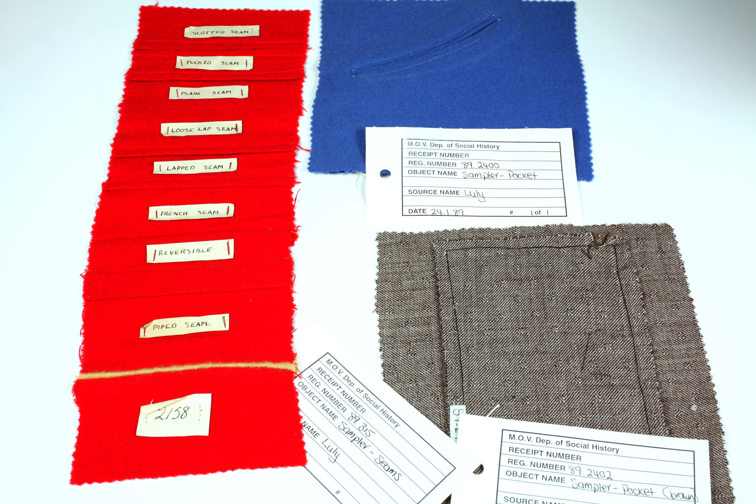 A rectangular piece of red material with eight different seams sewn on it, and the name of each seam placed above it. The name of each seam is written on a paper label and sewn on the fabric. At the bottom of the red piece of material is a paper label with an identification number on it: also sewn on the material. The edges of the material are jagged, and have been cut with fabric scissors.
